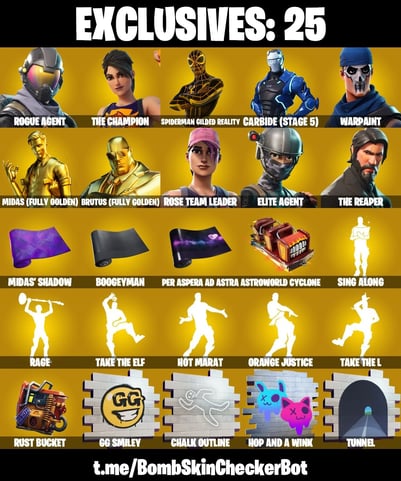 🔮145 Skins🔮 Kiss The Cup💎Midas (Fully Golden)💎Laugh It Up💎Take The Elf💎Rust Bucket💎Candy Axe💎Reaper Axe💎Star Wand💎Harley Hitter💎Tony Stark💎Crystal💎Lara Croft💎Neymar Jr