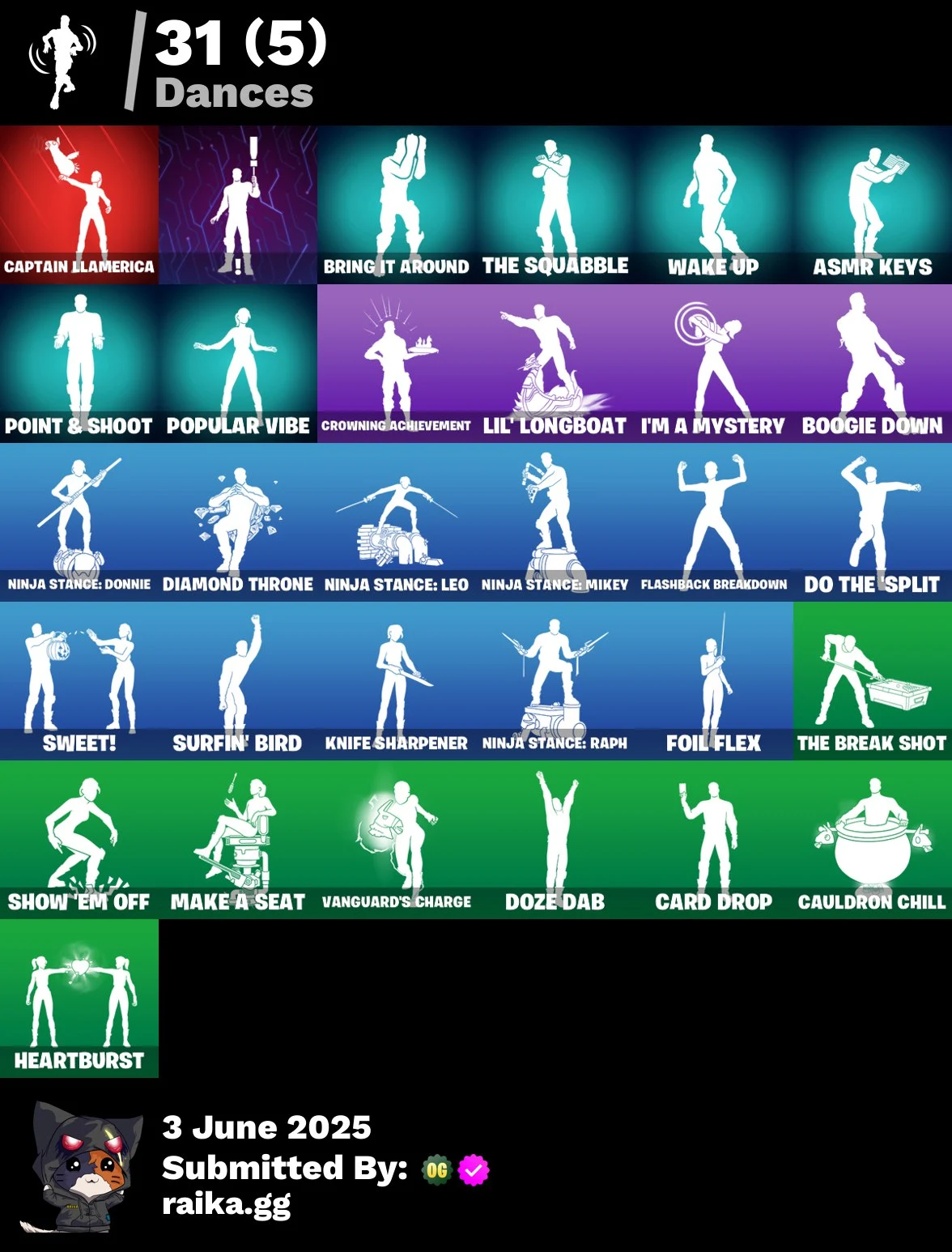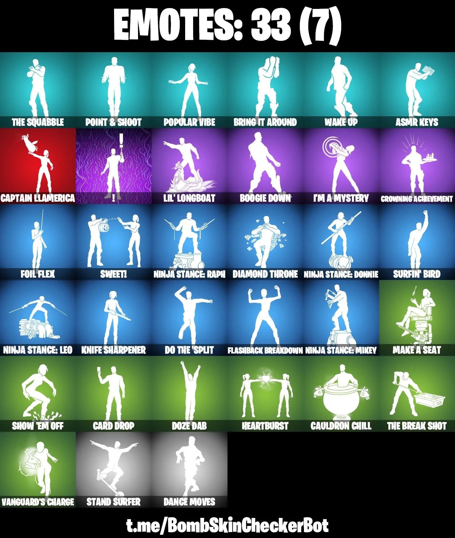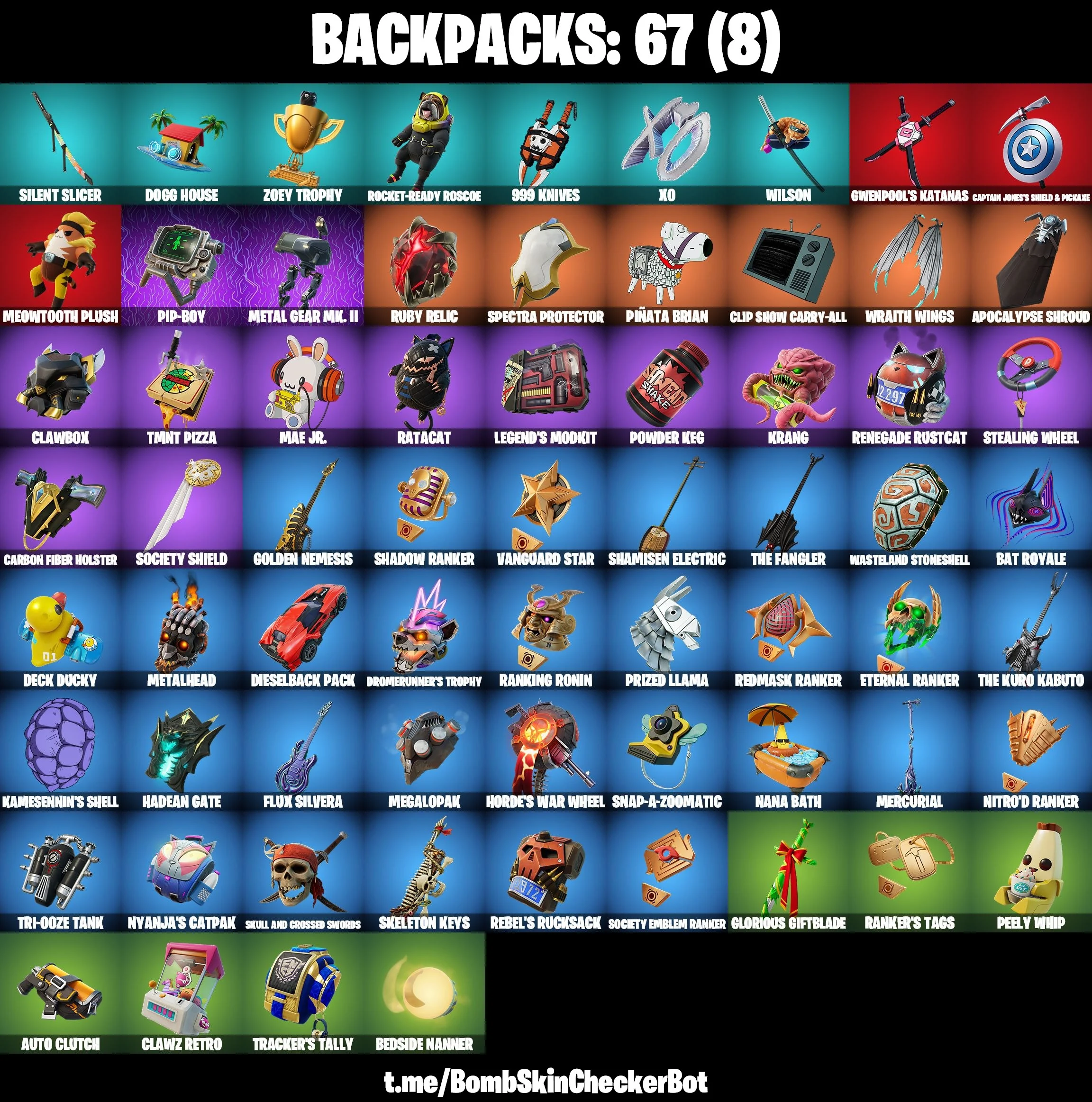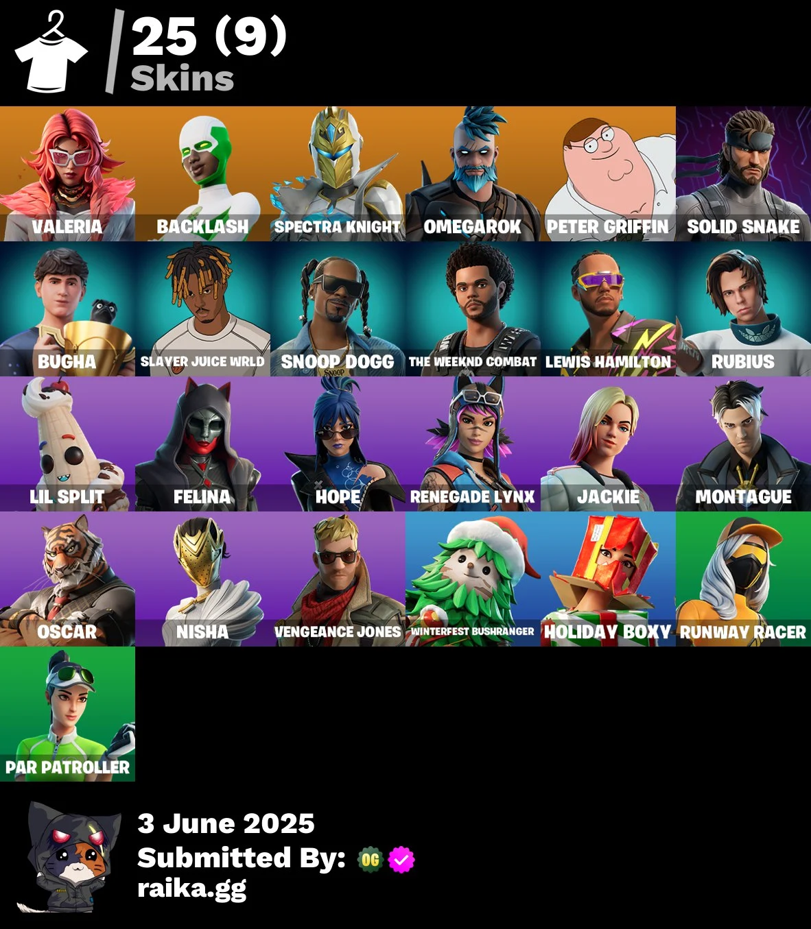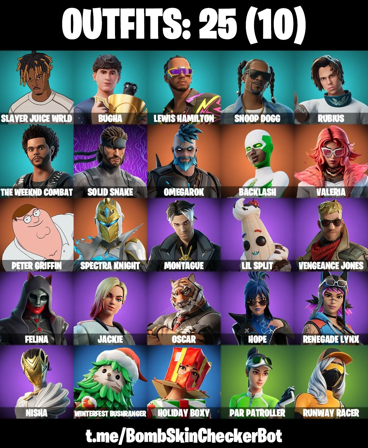 25 skins | Valeria | Backlash | Spectra Knight | Omegarok | Peter Griffin | Solid Snake | Bugha | Slayer Juice WRLD | Snoop Dogg | 500 VB | Nai@1
