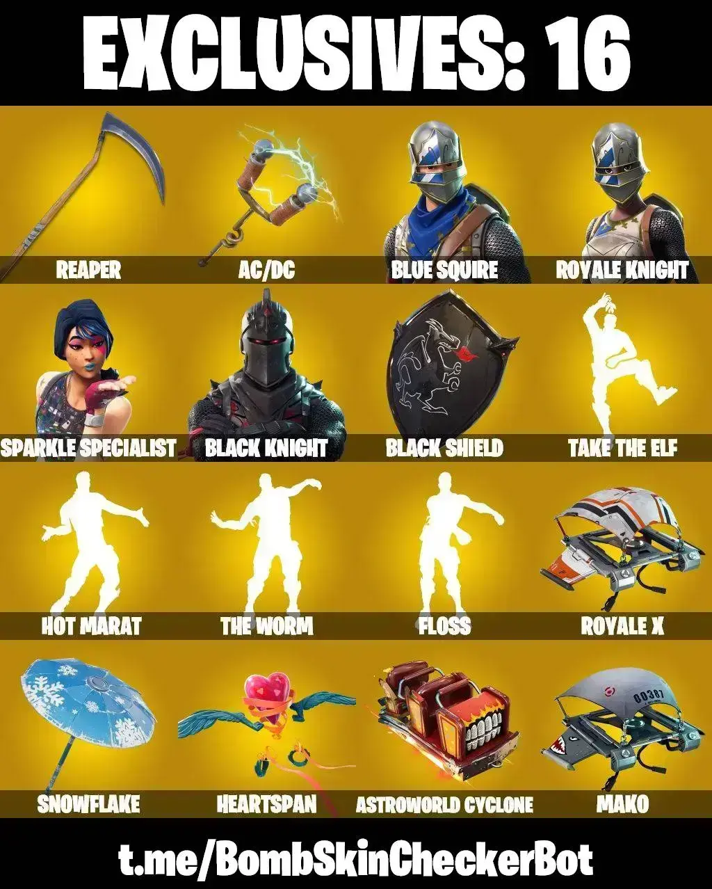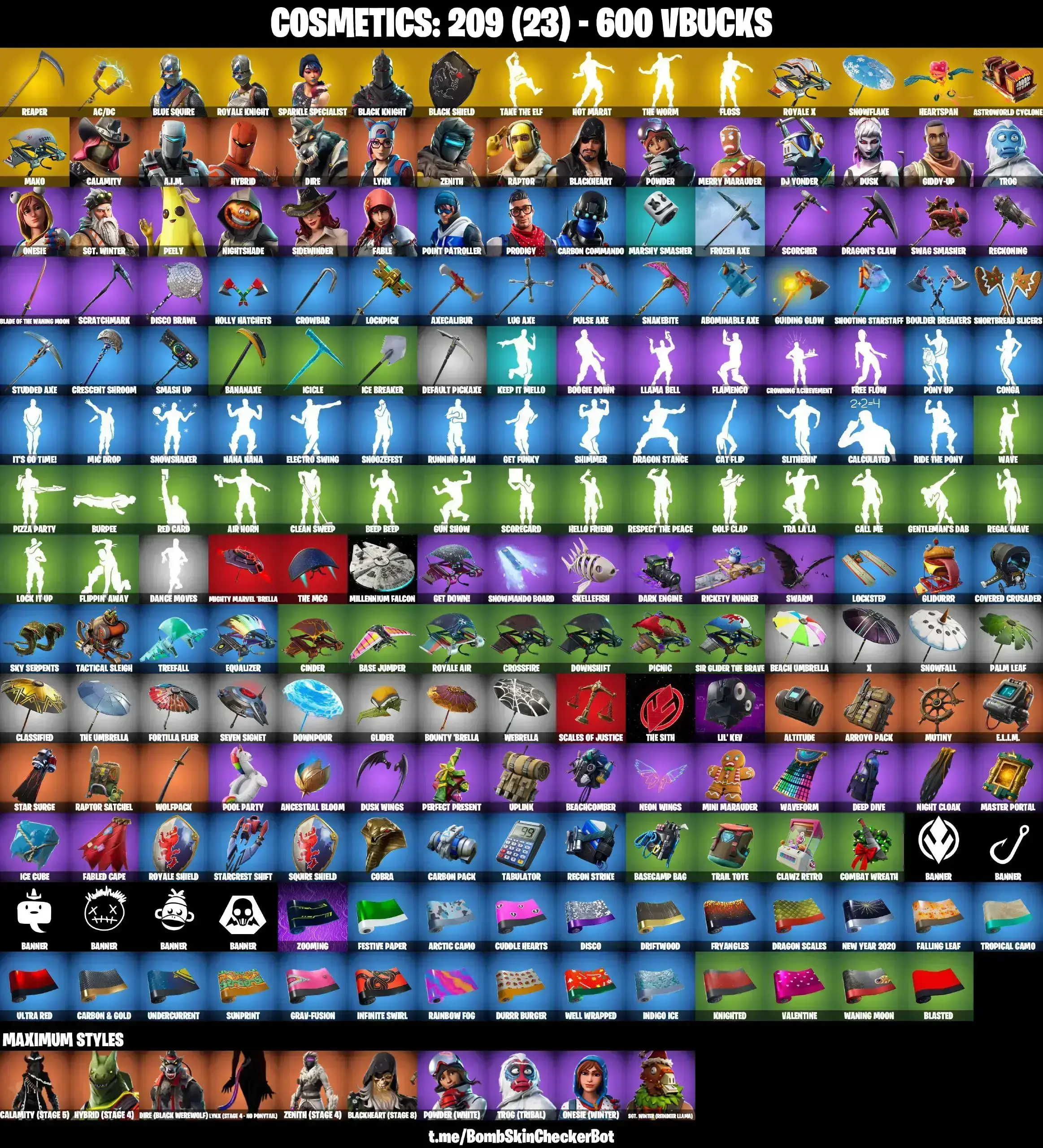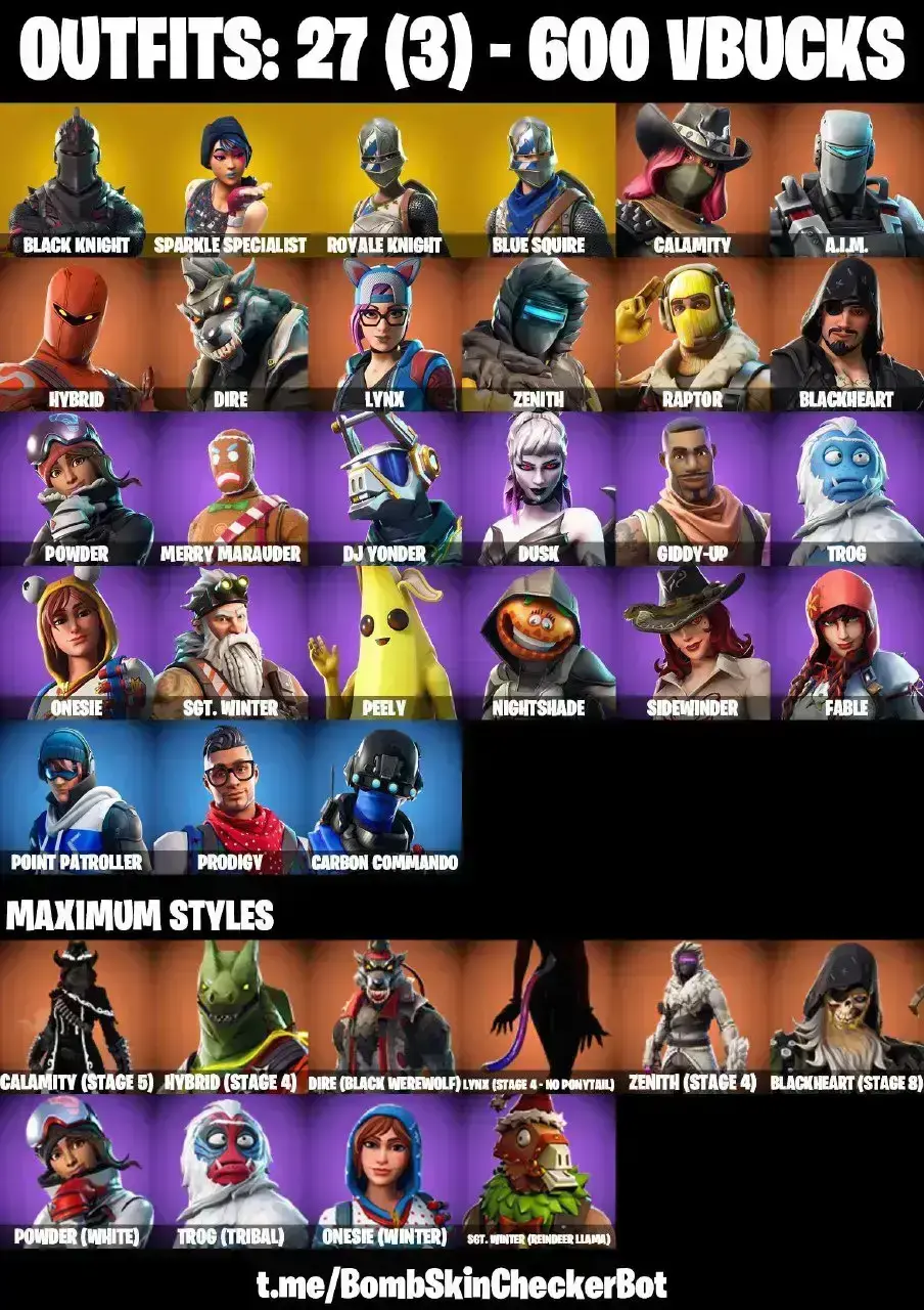 27 SKINS | BLACK KNIGHT | MAKO | ROYALE KNIGHT | BLUE SQUIRE | FLOSS | THE WORM | SPARKLE SPECIALIST | ONESIE MAX | CALAMITY STAGE 5 | LYNX STAGE 4 | ZENITH STAGE 4 | PEELY | ASTROWORLD CYCLONE | SNOWFLAKE | REAPER | ICE BREAKER |