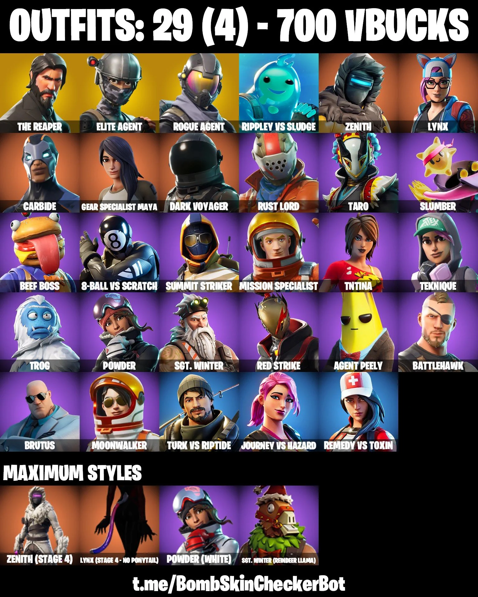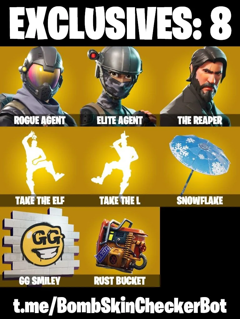 🔮29 Skins🔮 The Reaper💎Take The L💎Rogue Agent💎Elite Agent💎Take The Elf💎Rust Bucket💎Snowflake
