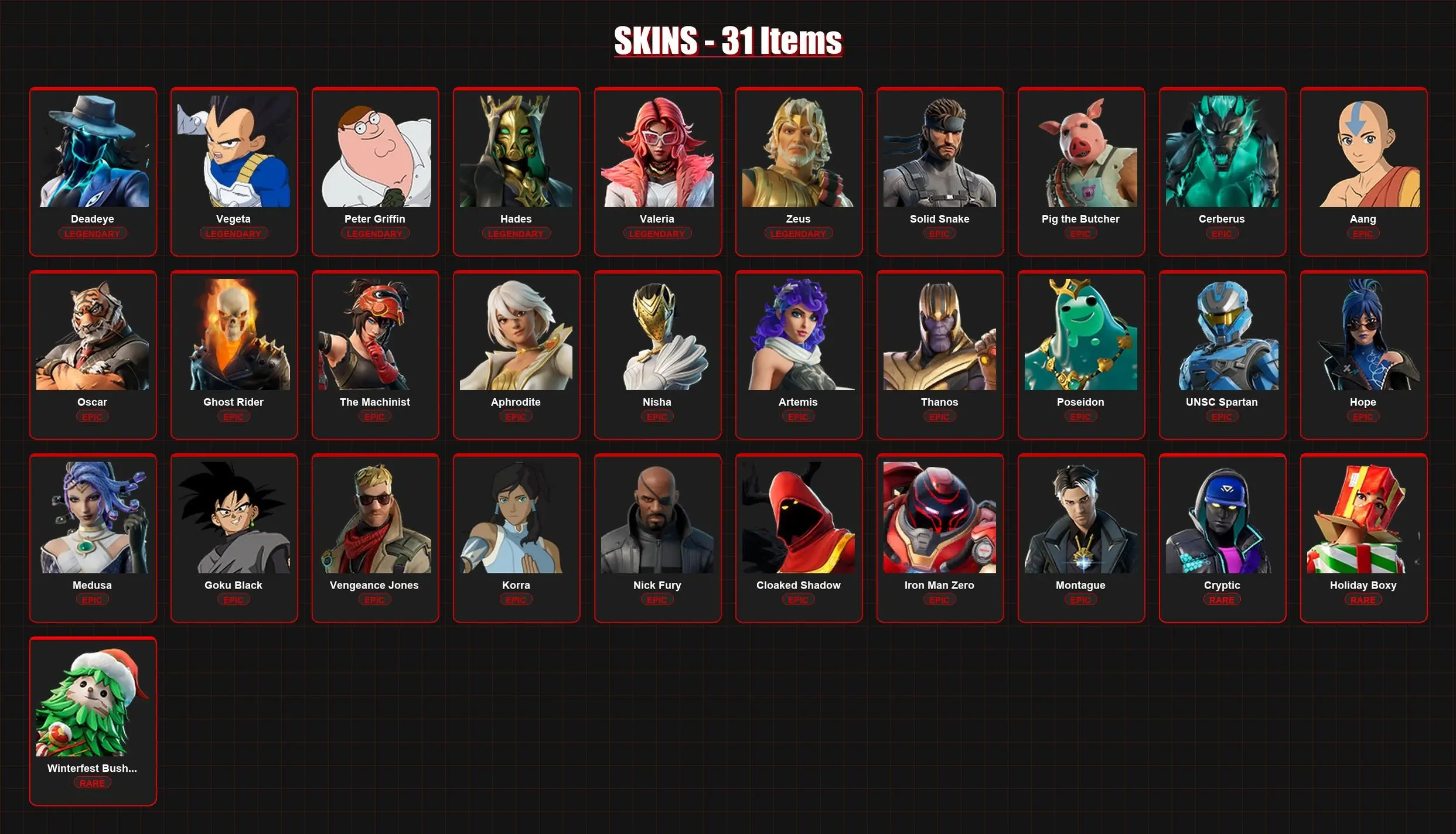 31 Skins | Deadeye | Vegeta | Peter Griffin | Hades | Valeria | Zeus | Solid Snake | Pig the Butcher | Cerberus | Aang | Lvl 469