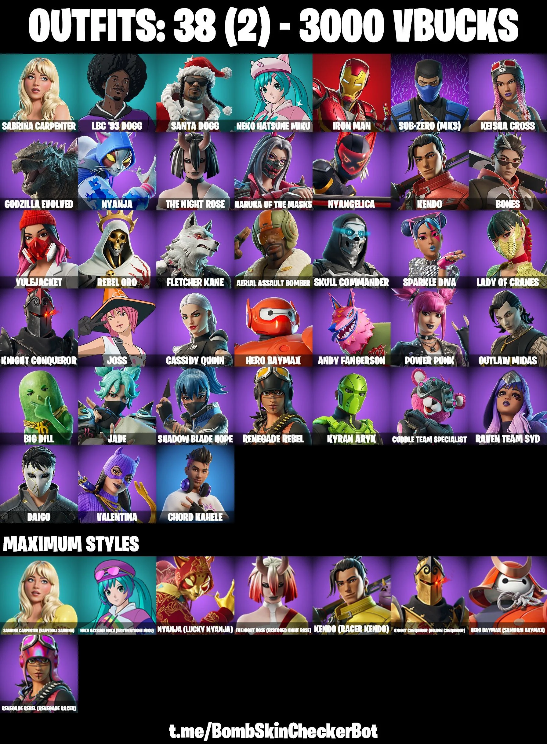 🔮38 Skins🔮 Sabrina Carpenter💎LBC '93 Dogg💎Santa Dogg💎Neko Hatsune Miku💎Iron Man💎Sub-Zero (MK3)💎Keisha Cross💎Godzilla Evolved💎Nyanja💎The Night Rose💎Haruka of the Masks💎Nyangelica💎Kendo💎