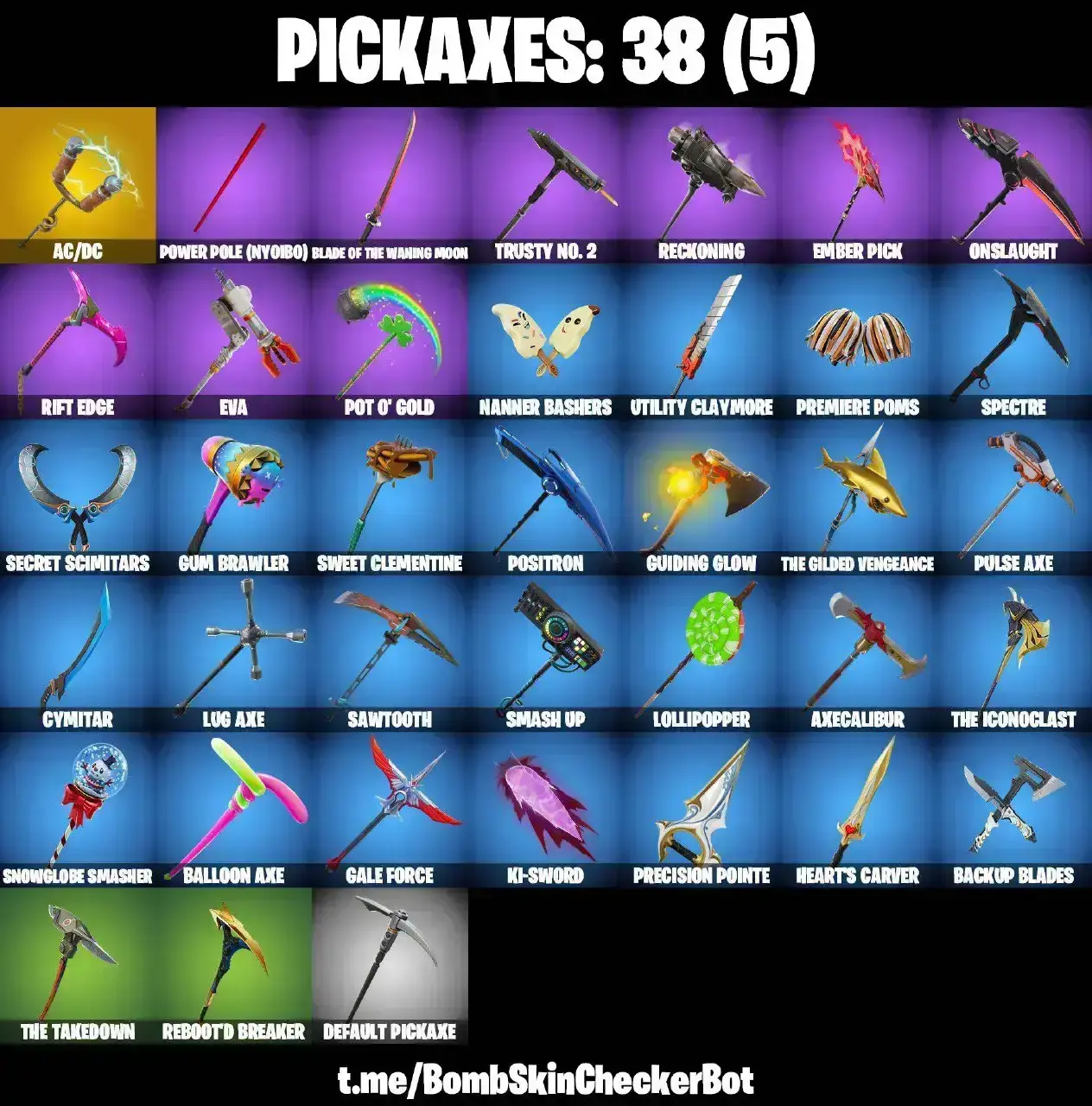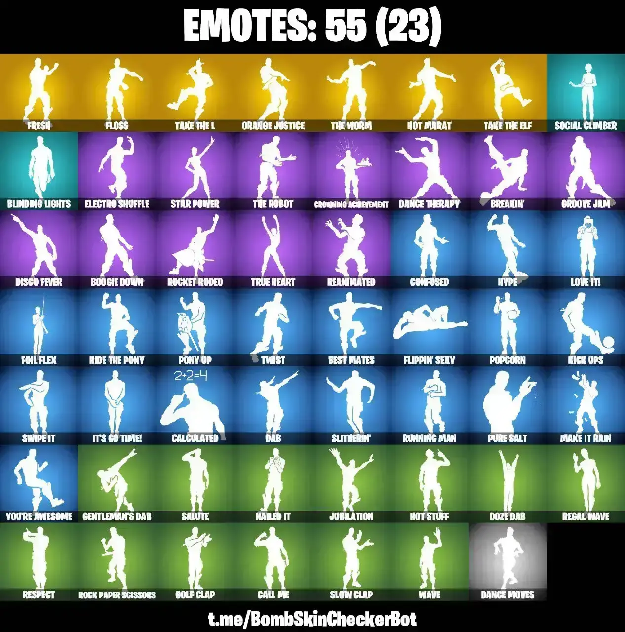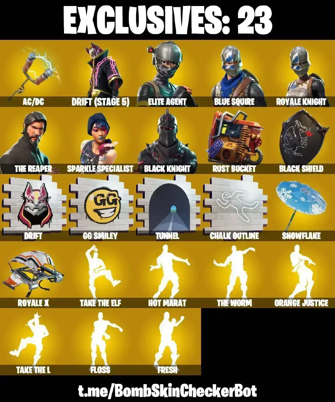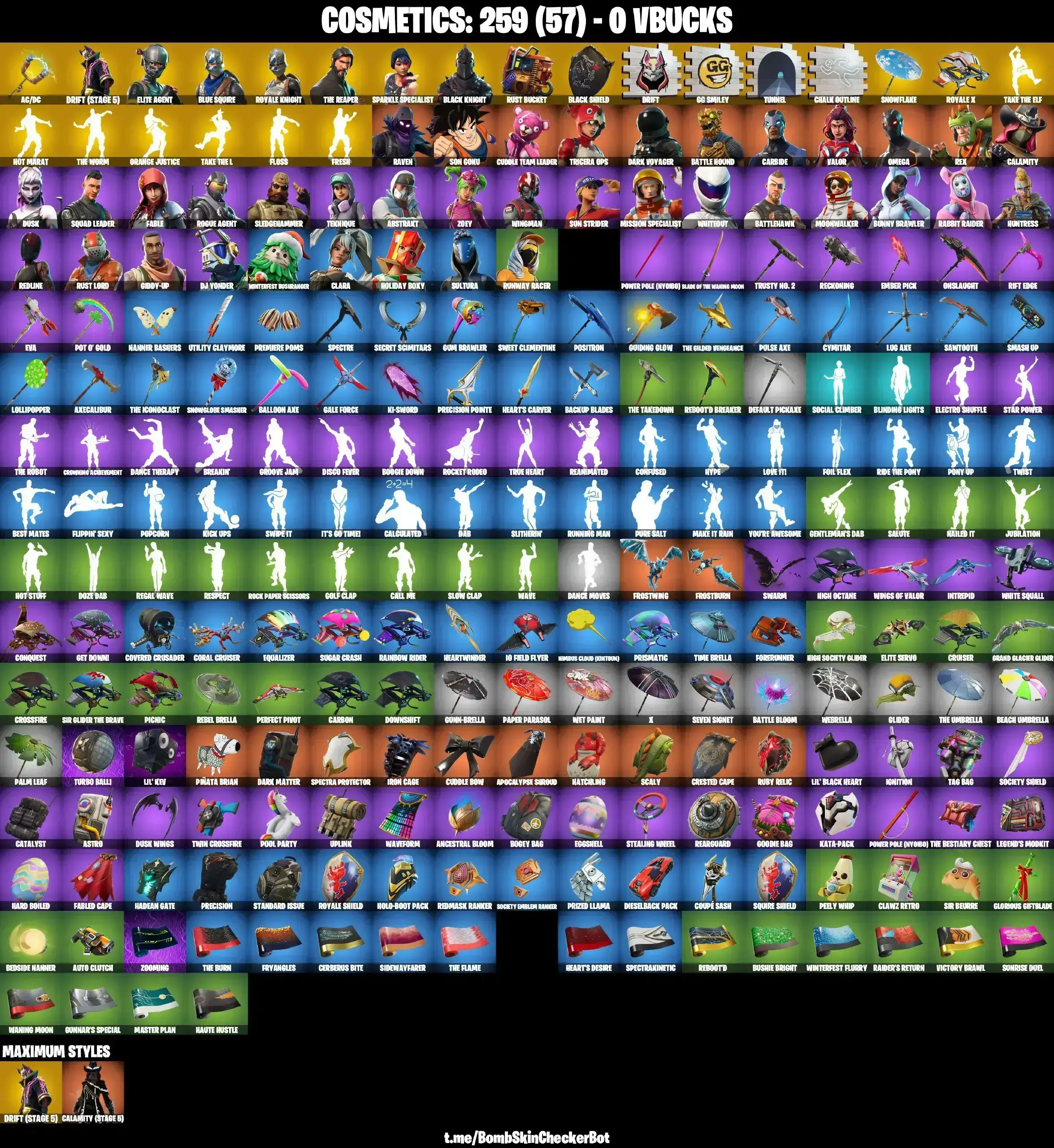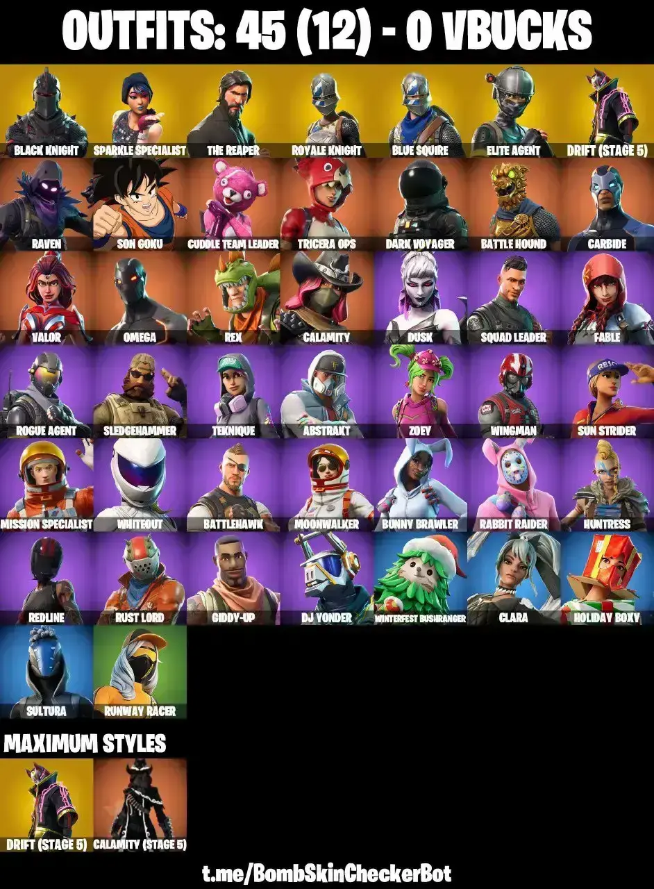 45 SKINS | BLACK KNIGHT | TAKE THE L | THE REAPER | ELITE AGENT | ROYALE KNIGHT | BLUE SQUIRE | FRESH | FLOSS | THE WORM | OMEGA | ORANGE JUSTICE | SON GOKU | ZOEY | DRIFT STAGE 5 | CALAMITY STAGE 5 | RUNWAY RACER | RUST BUCKET |
