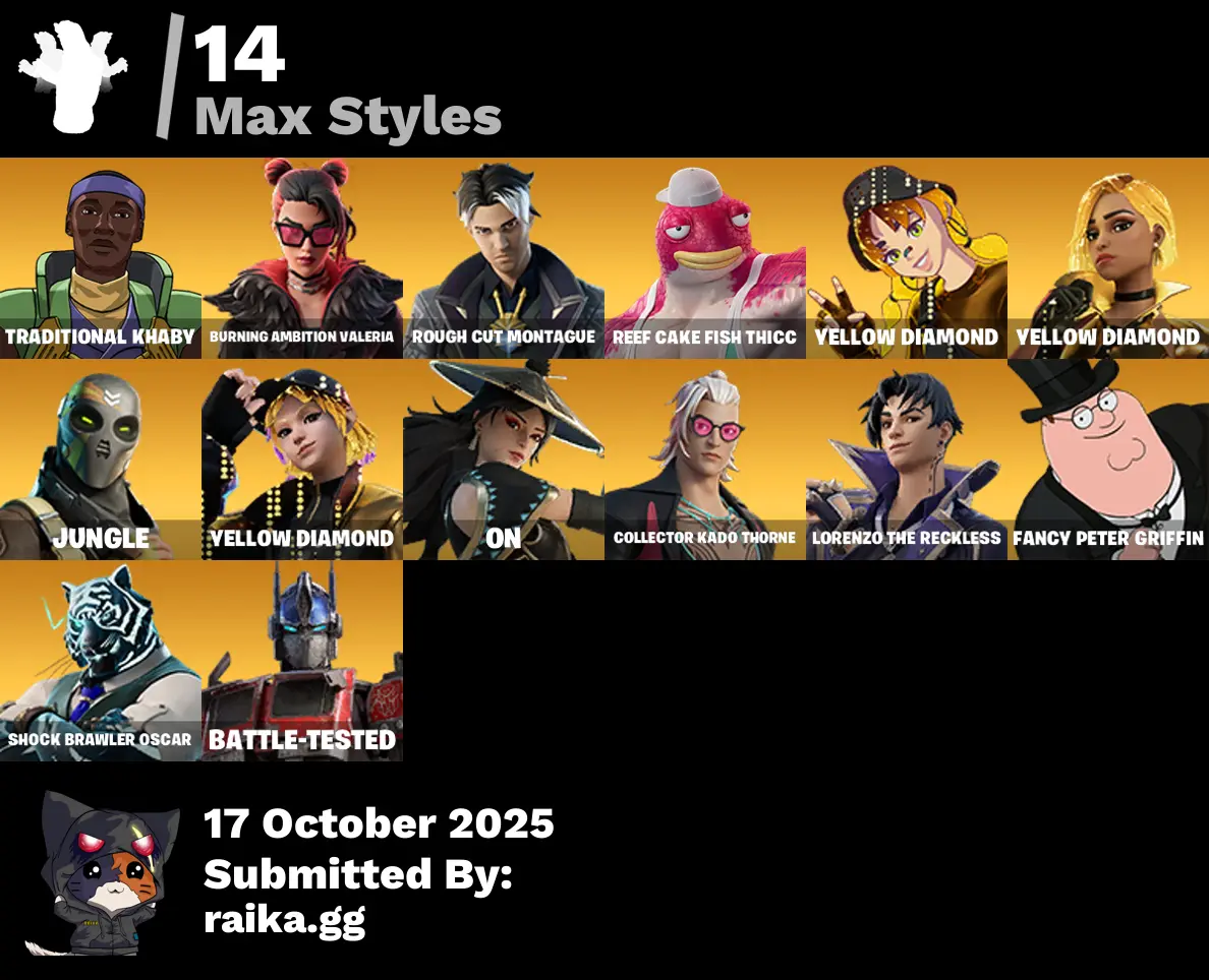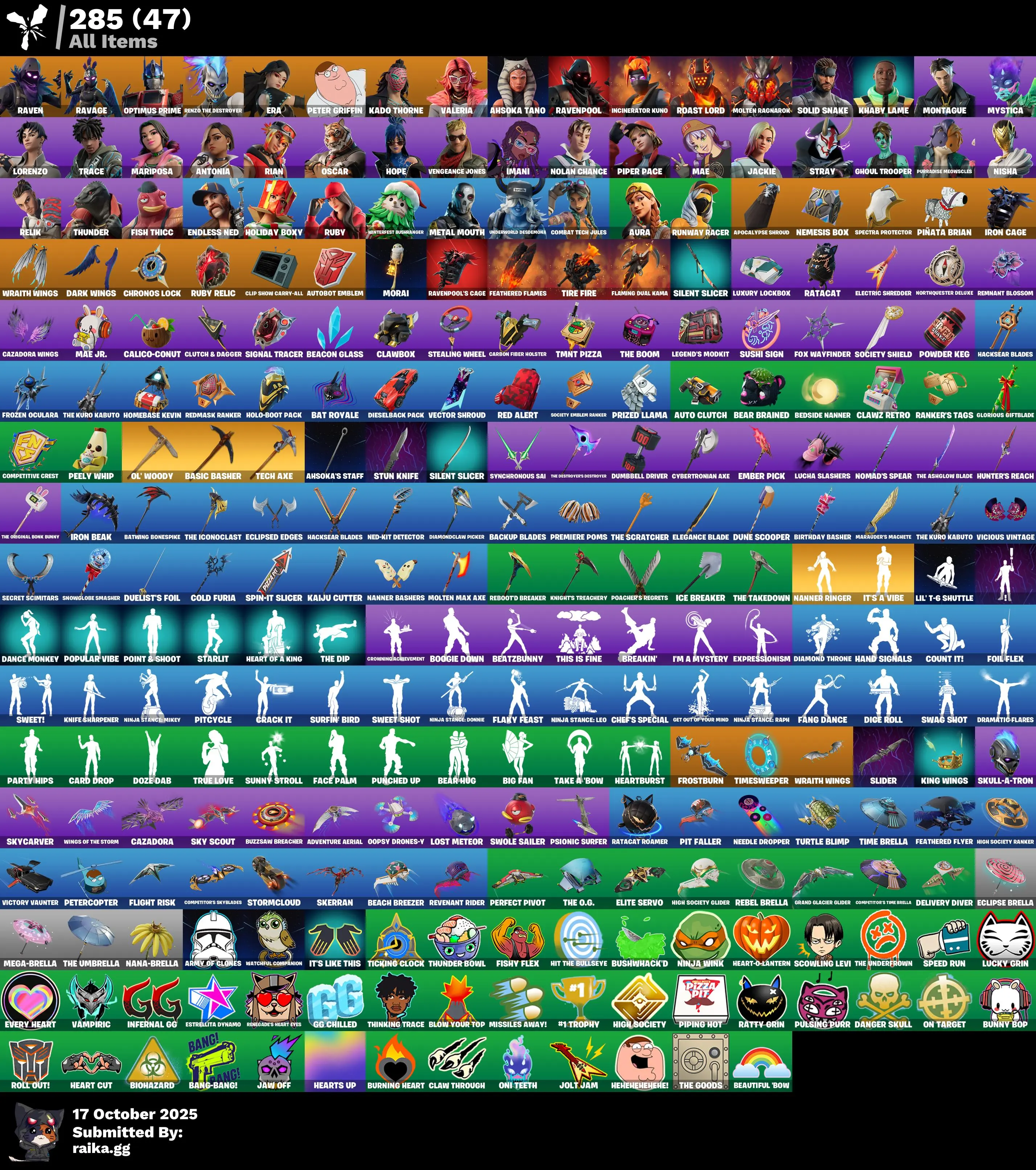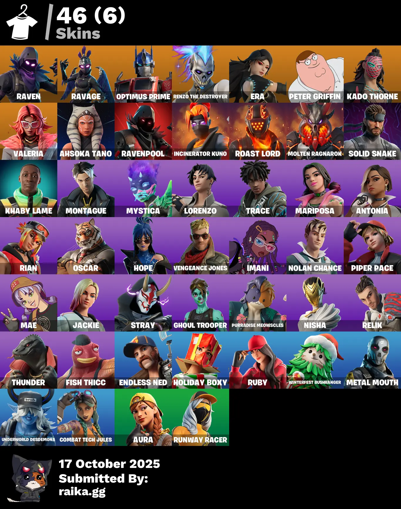 46 skins | Mystica🐔Khaby Lame🐔Antonia🐔Rian🐔Ravenpool🐔Mariposa🐔Incinerator Kuno🐔Valeria🐔Renzo the Destroyer🐔Trace🐔Oscar🐔Ravage🐔Molten Ragnarok🐔Raven🐔Peter Griffin🐔Montague🐔Optimus Prime🐔Solid Snake🐔Kado Thorne🐔Roast Lord D5141