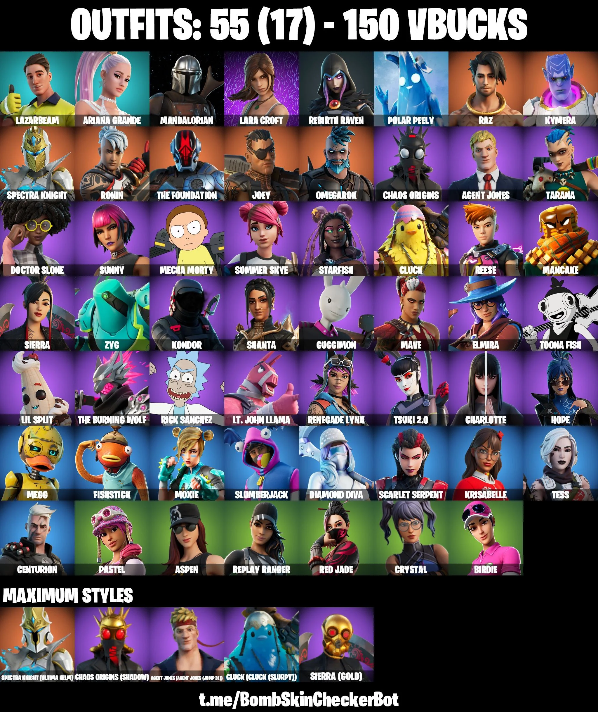 🔮55 Skins🔮 Ariana Grande💎Crystal💎Lara Croft💎Polar Peely💎Krisabelle💎Rick Sanchez💎Toona Fish💎Mandalorian💎Fishstick💎Birdy