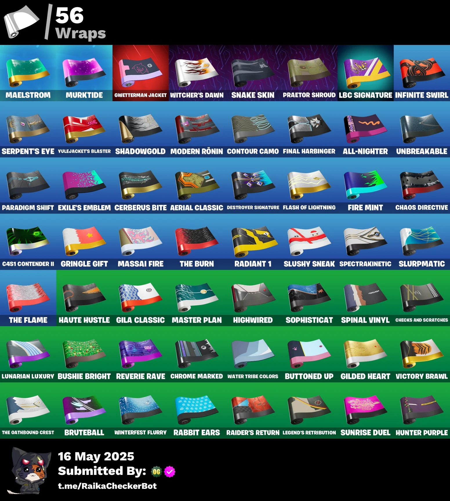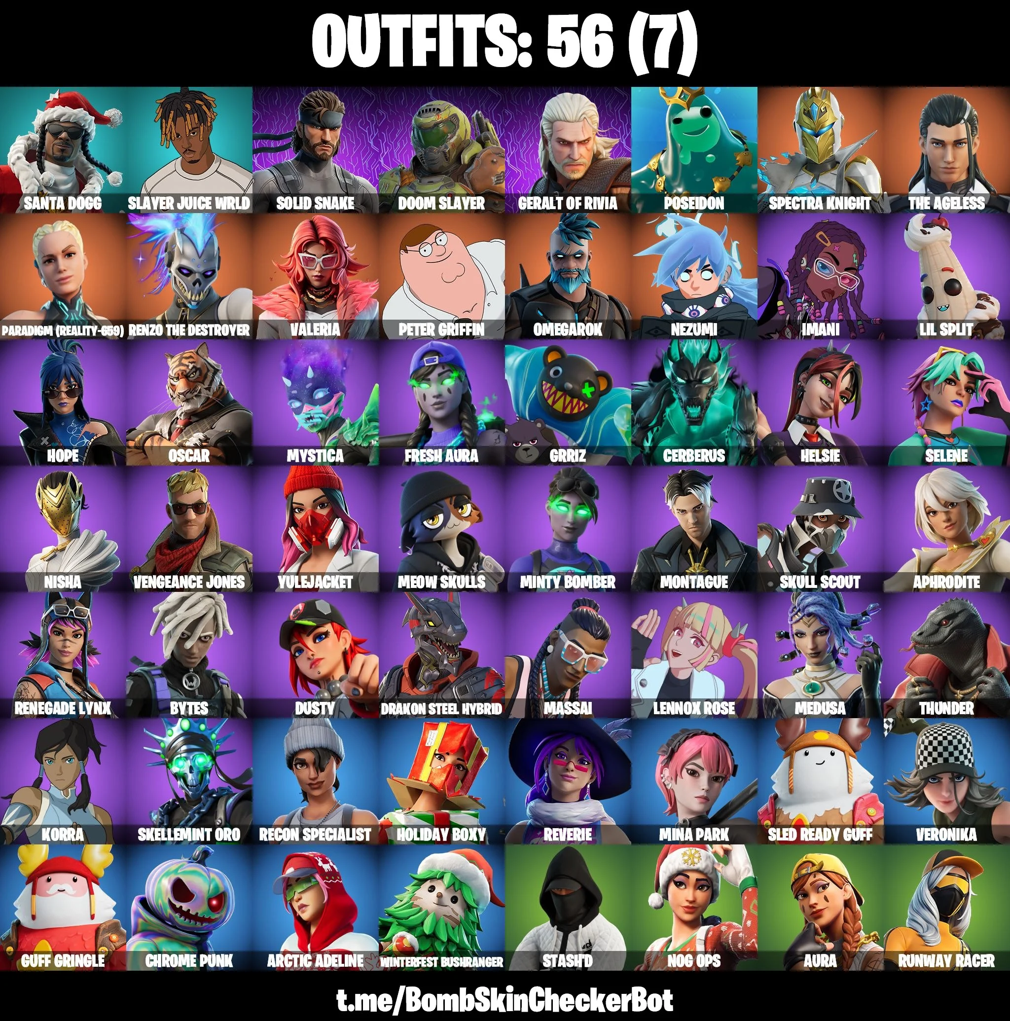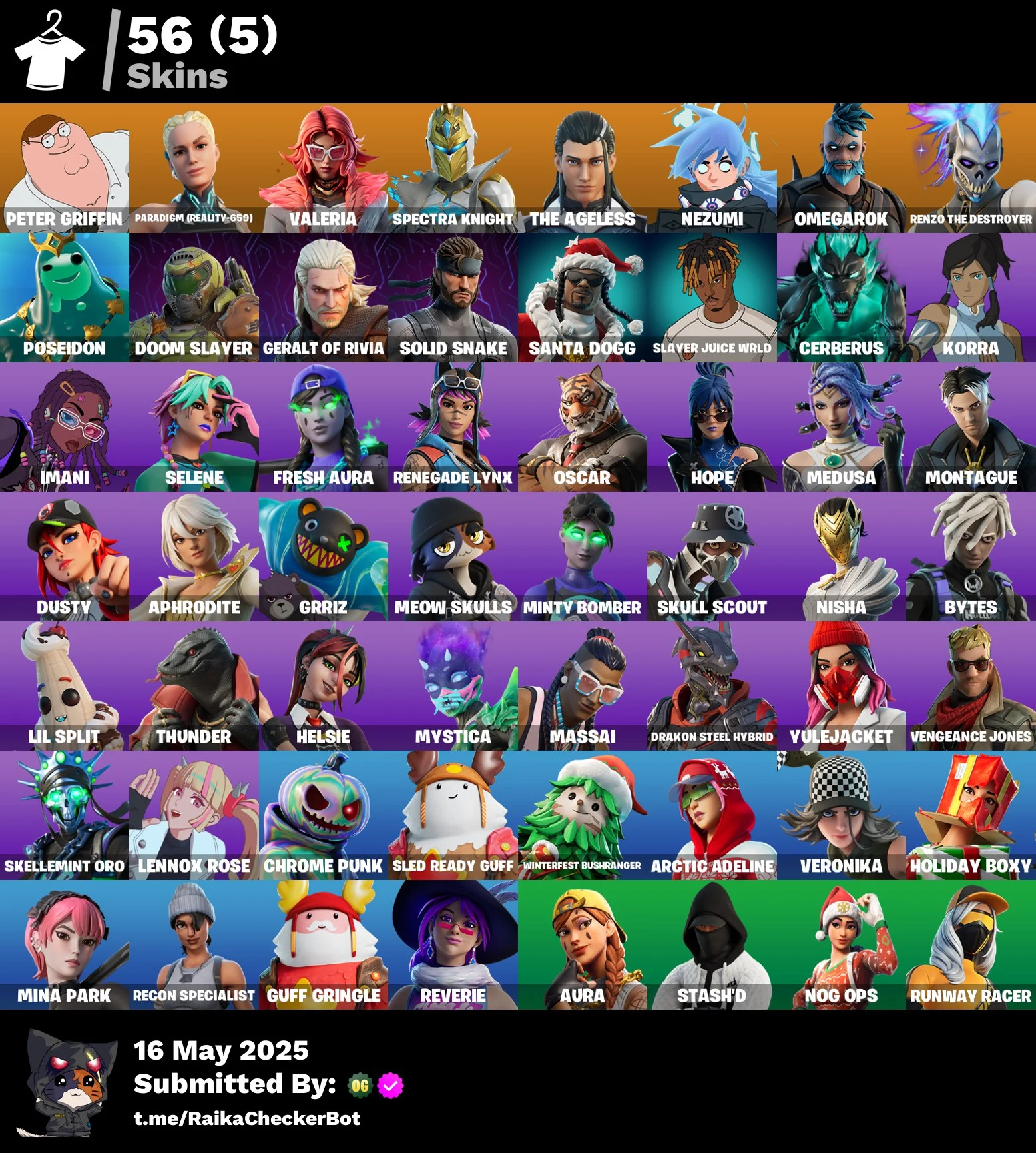 56 skins | Peter Griffin | Paradigm (Reality-659) | Valeria | Spectra Knight | The Ageless | Nezumi | Omegarok | Renzo the Destroyer | Poseidon | 600 VB | Nai@1