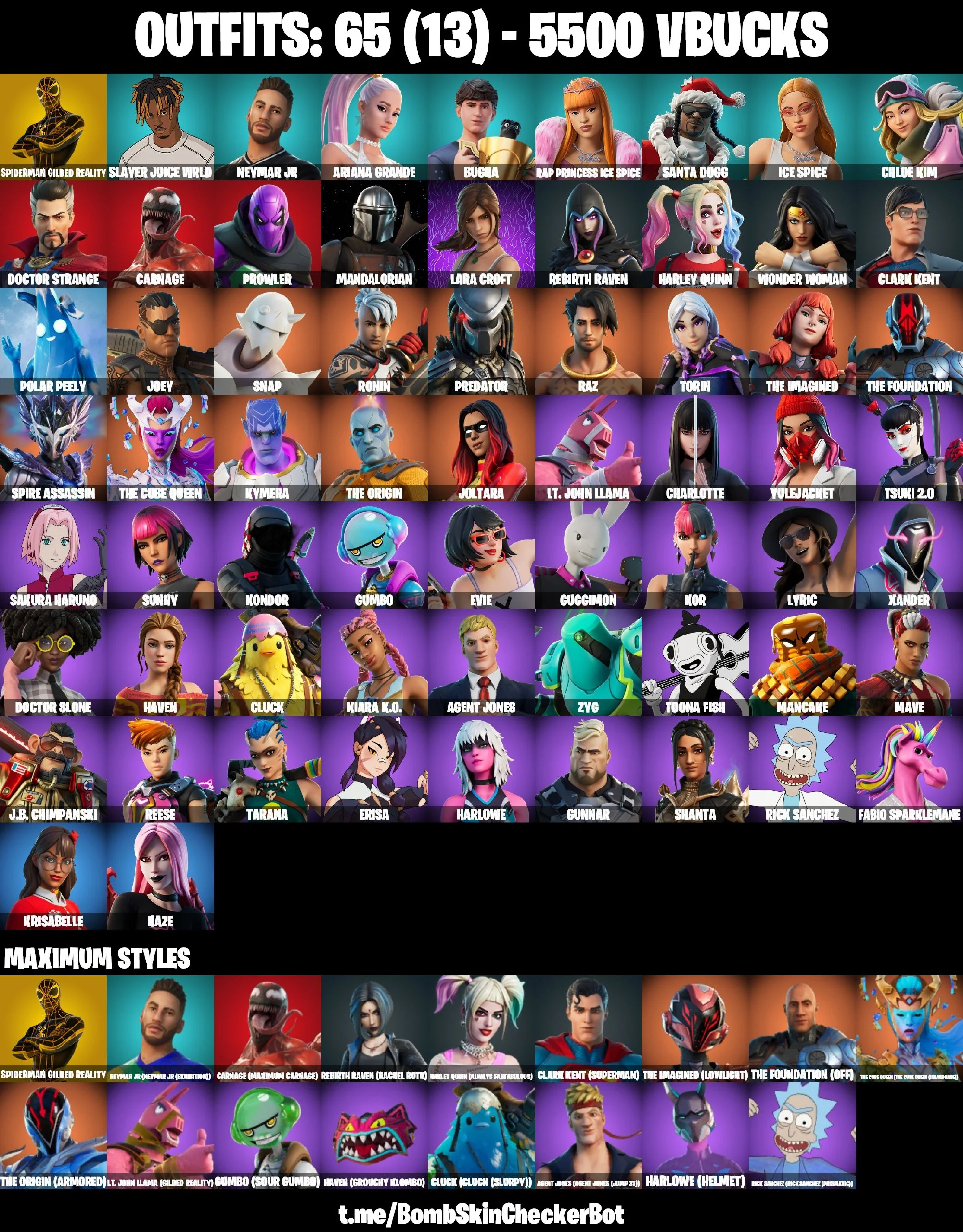 🔮65 Skins🔮 Ariana Grande💎Laugh It Up💎Sakura Haruno💎Lara Croft💎Neymar Jr💎Harley Quinn💎Joltara💎Erisa💎Clark Kent💎Polar Peely💎Krisabelle💎Doctor Strange💎Rick Sanchez💎Predator💎Toona Fish