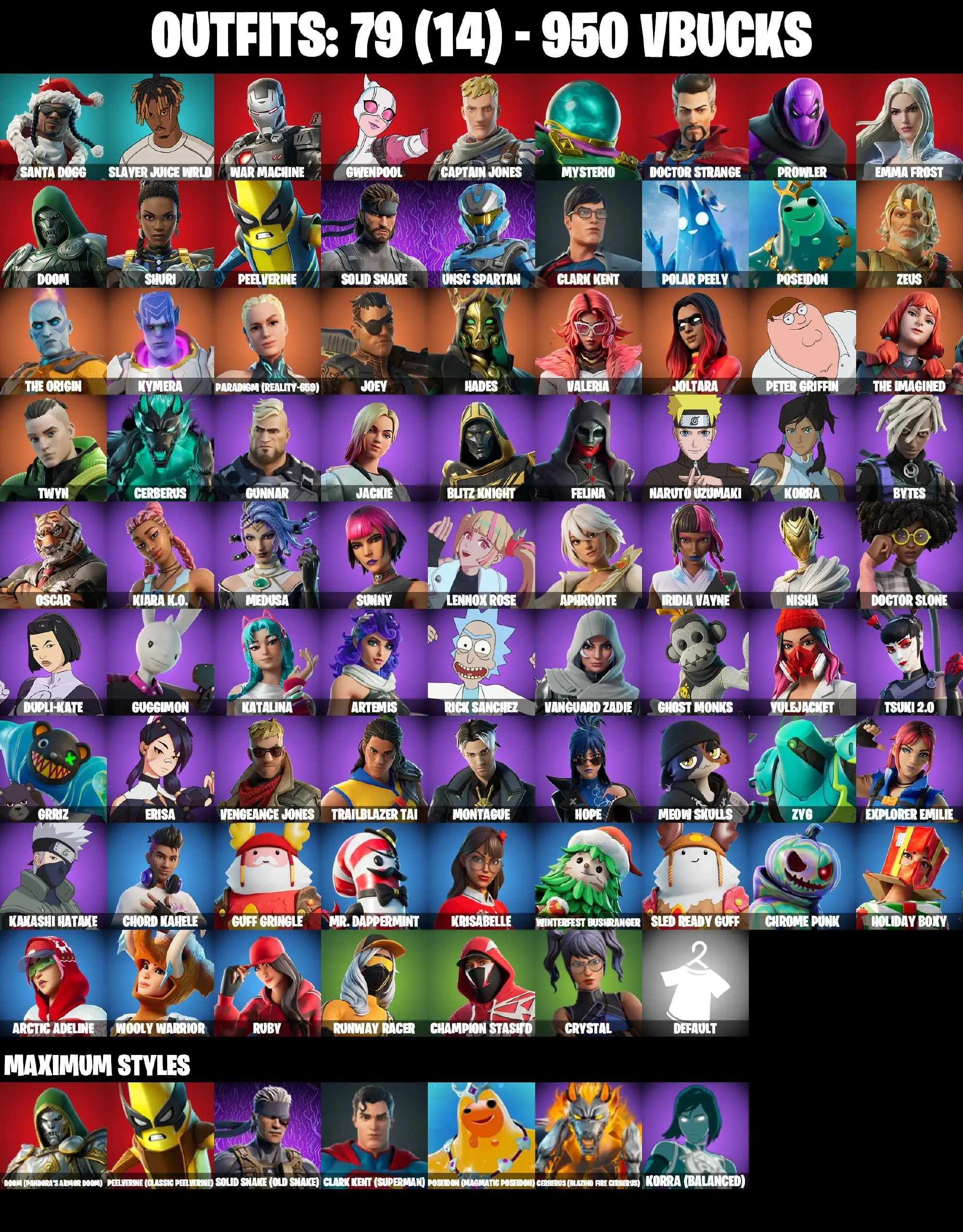 79 SKINS | JOLTARA | GET GRIDDY | NARUTO | KAKASHI | CLARK KENT SUPERMAN | ARTEMIS | TSUKI 2.0 | DUPLI-KATE | MEOW SKULLS | HOPE | ASTROWORLD CYCLONE | PEPPERMINT PICK | TAKE THE ELF | CAN PLAY ON XBOX,PC,NINTENDO,MOBILE | 950 VBU