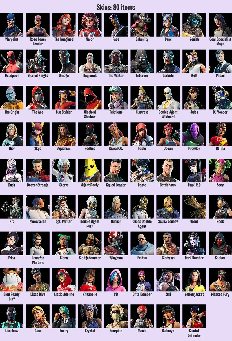 80 Skins|OG STW|Warpaint|Rose Team Leader|The Imagined|Valor|Fade|Calamity|Lynx|Zenith|Gear Specialist Maya|Deadpool|Eternal Knight|Omega