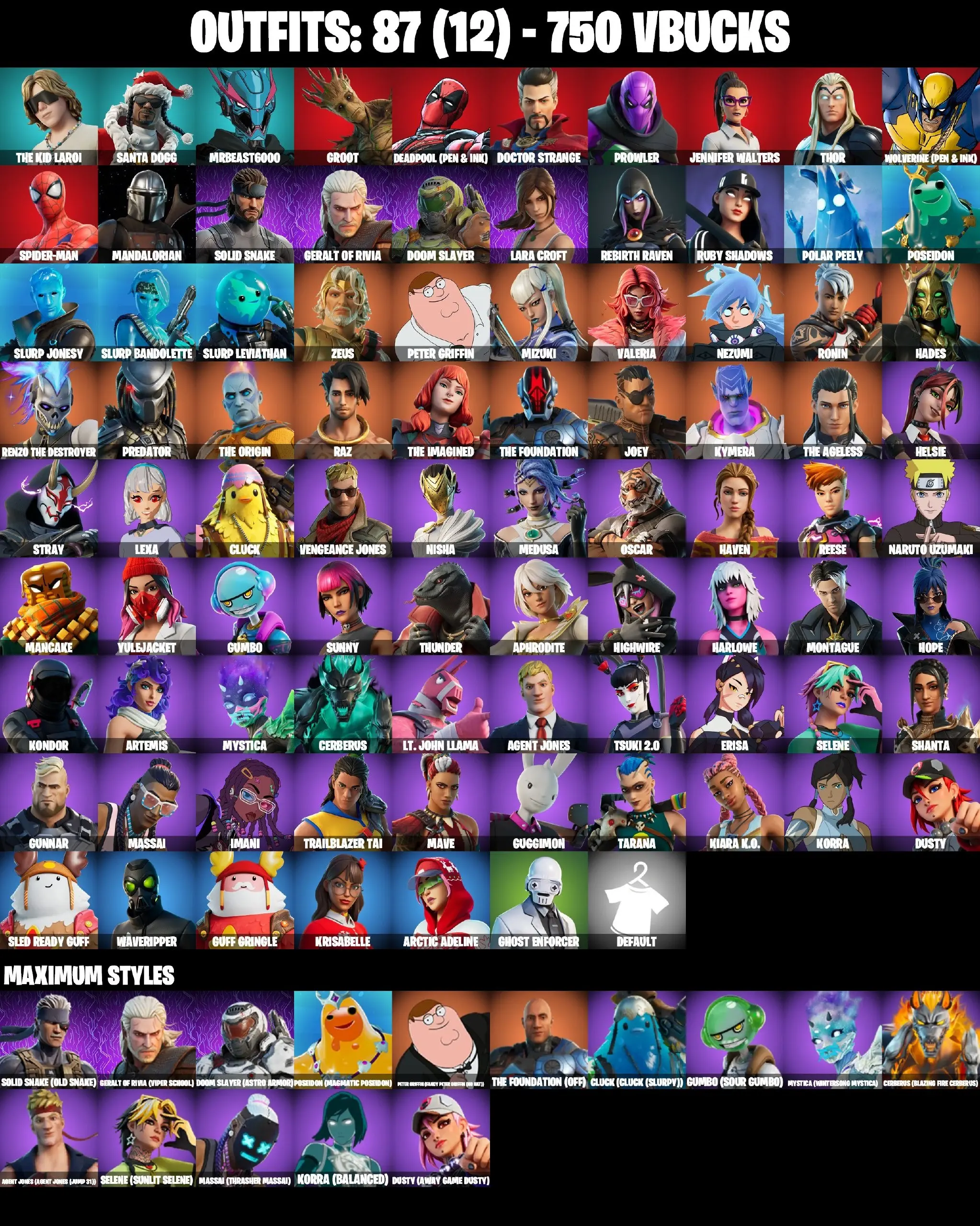 87 SKINS | LARA CROFT | MANDALORIAN | GET GRIDDY | SPIDER-MAN | NARUTO | PREDATOR | MYSTICA MAX | HELSIE | ARTEMIS | TSUKI 2.0 | HOPE | SELENE MAX | DUSTY MAX | CAN PLAY ON PSN,XBOX,PC,NINTENDO,MOBILE | 750 VBUCKS | FULL EMAIL ACC