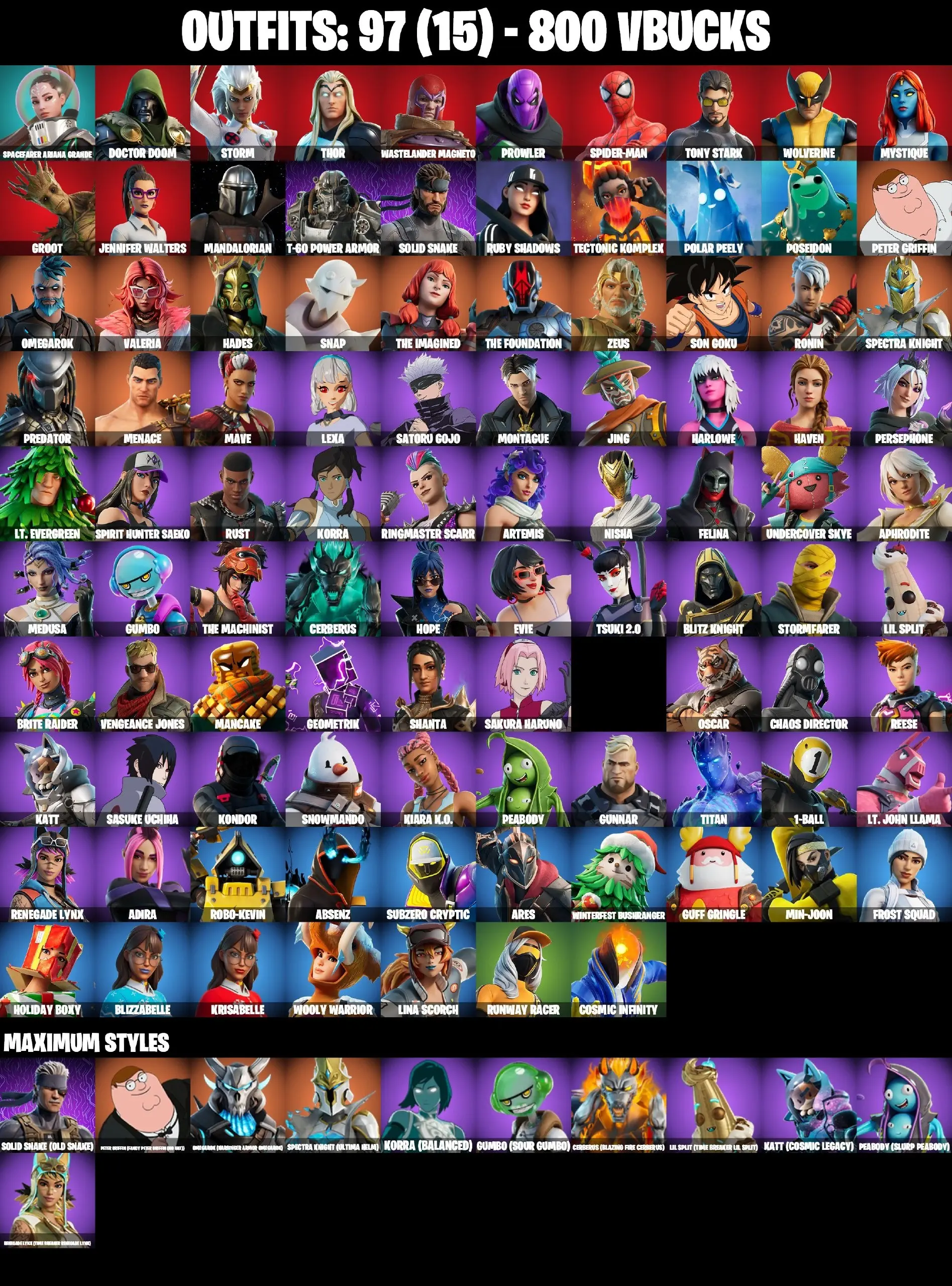 97 SKINS | SATORU GOJO | MANDALORIAN | SPIDER-MAN | SASUKE | SAKURA HARUNO | SON GOKU | KATT MAX | PERSEPHONE | SPIRIT HUNTER SAEKO | ARTEMIS | EVIE | TSUKI 2.0 | ARES | PEPPERMINT PICK | CAN PLAY ON PSN,XBOX,PC,NINTENDO,MOBILE |