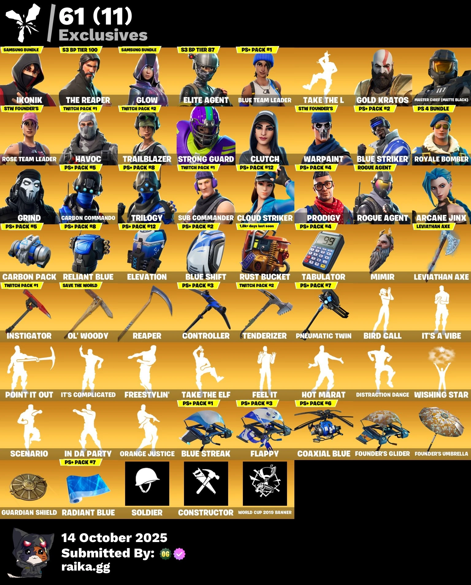 [All Platforms Linkable ] 373 skins 👑 IKONIK 🪙 OG STW ⚡ Leviathan Axe 🌟 The Reaper 🌟 Glow 🌟 Elite Agent 🌟 Blue Team Leader 🌟 Gold Kratos 🌟 Master Chief (Matte Black) 🌟 Havoc 🌟 Trailblazer
