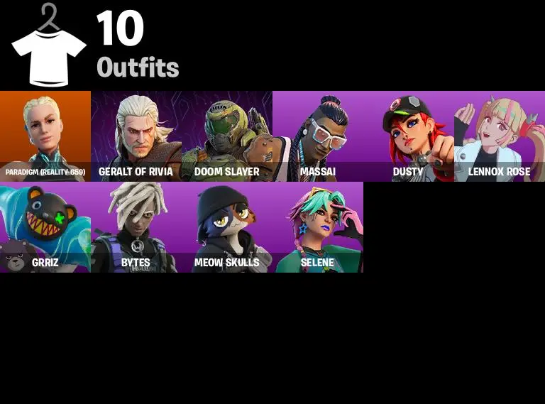 【PC/NS/XBOX/PSN】 10 SKINS 🔥 PARADIGM (REALITY-659) 🔥 DOOM SLAYER 🔥 GERALT OF RIVIA 🔥 DUSTY 🔥 BYTES 🔥 GRRIZ 🔥 MEOW SKULLS 🔥 LENNOX ROSE 🔥 200 VB