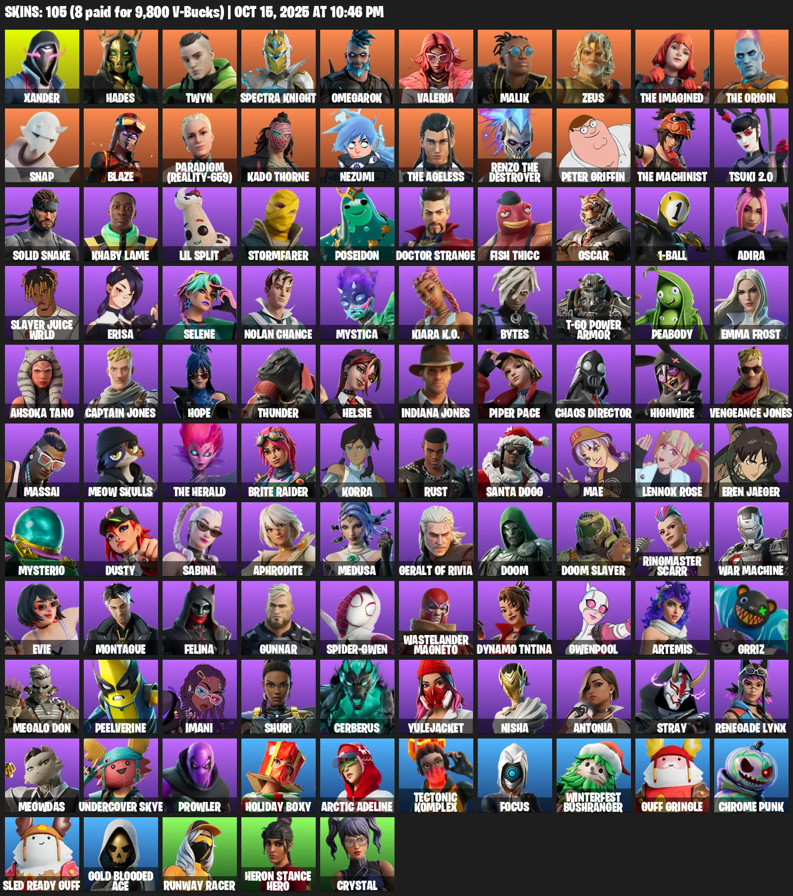 [PC/PSN/XBOX] | 105 skins | 1200 V-bucks | Xander | Hades | Twyn | Spectra Knight | Omegarok | Valeria | Malik | Zeus | #UML7372 | #MBFN
