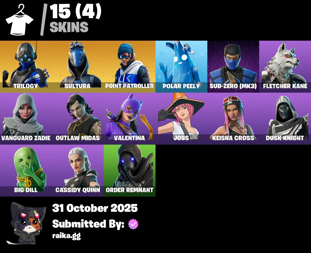 [PC/PSN/XBOX] 15 skins | Trilogy | Sultura | Point Patroller | Polar Peely | Sub-Zero (MK3) | Fletcher Kane | Vanguard Zadie | Outlaw Midas | Valentina | 200 VB