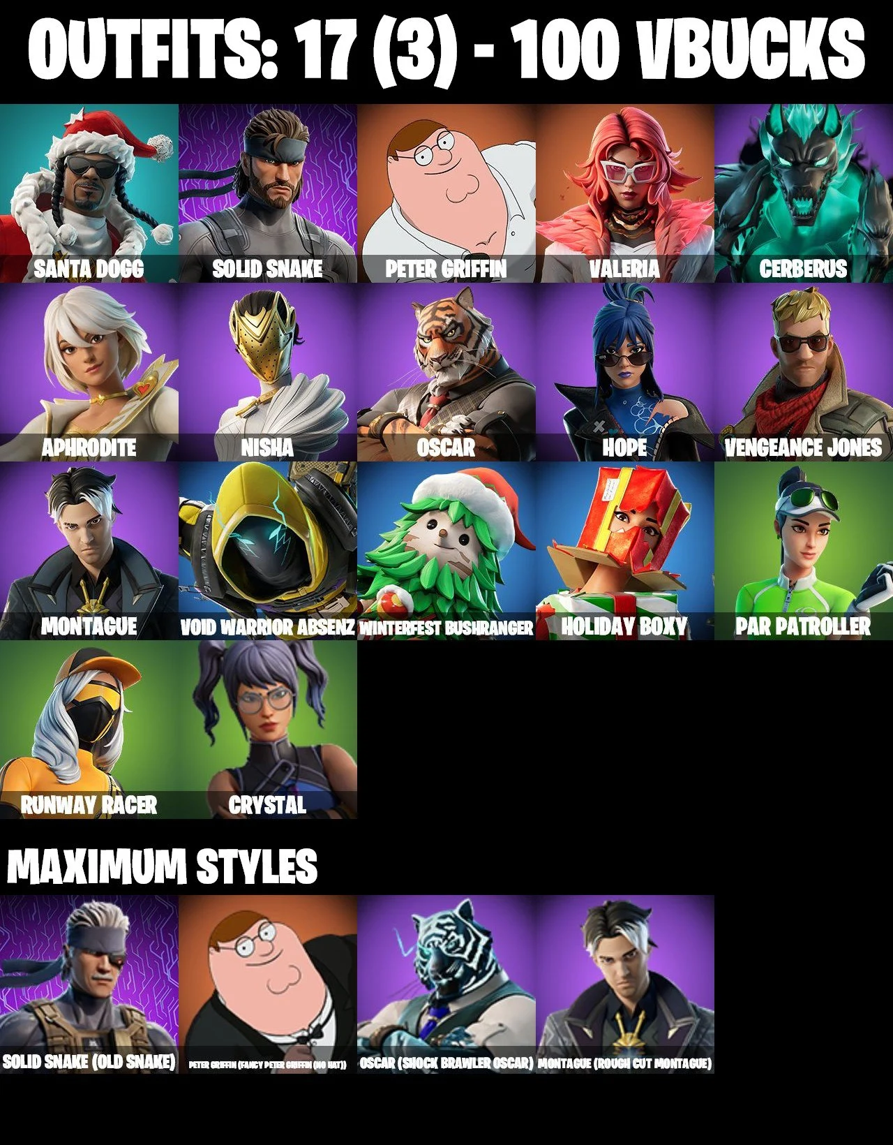 [PC/PSN/XBOX] 17 skins | Santa Dogg | Solid Snake | Peter Griffin | Valeria | Cerberus | Aphrodite | Nisha | Oscar | Hope | Vengeance Jones | Montague