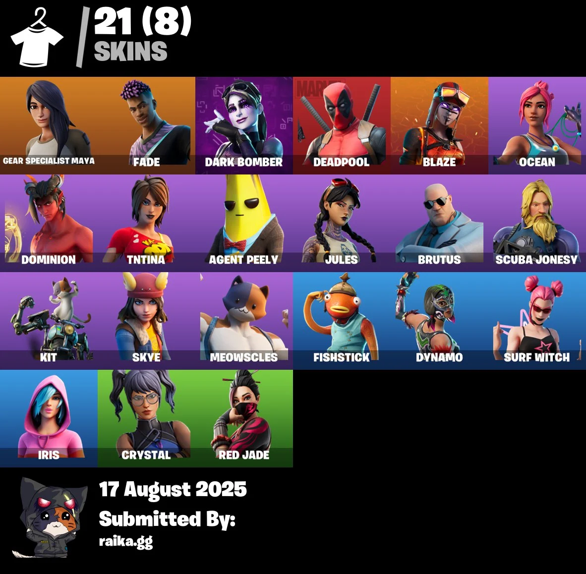 [PC/PSN/XBOX] 21 skins | Gear Specialist Maya | Fade | Dark Bomber | Deadpool | Blaze | Ocean | Dominion | TNTina | Agent Peely | Jules | Brutus | 400 VB