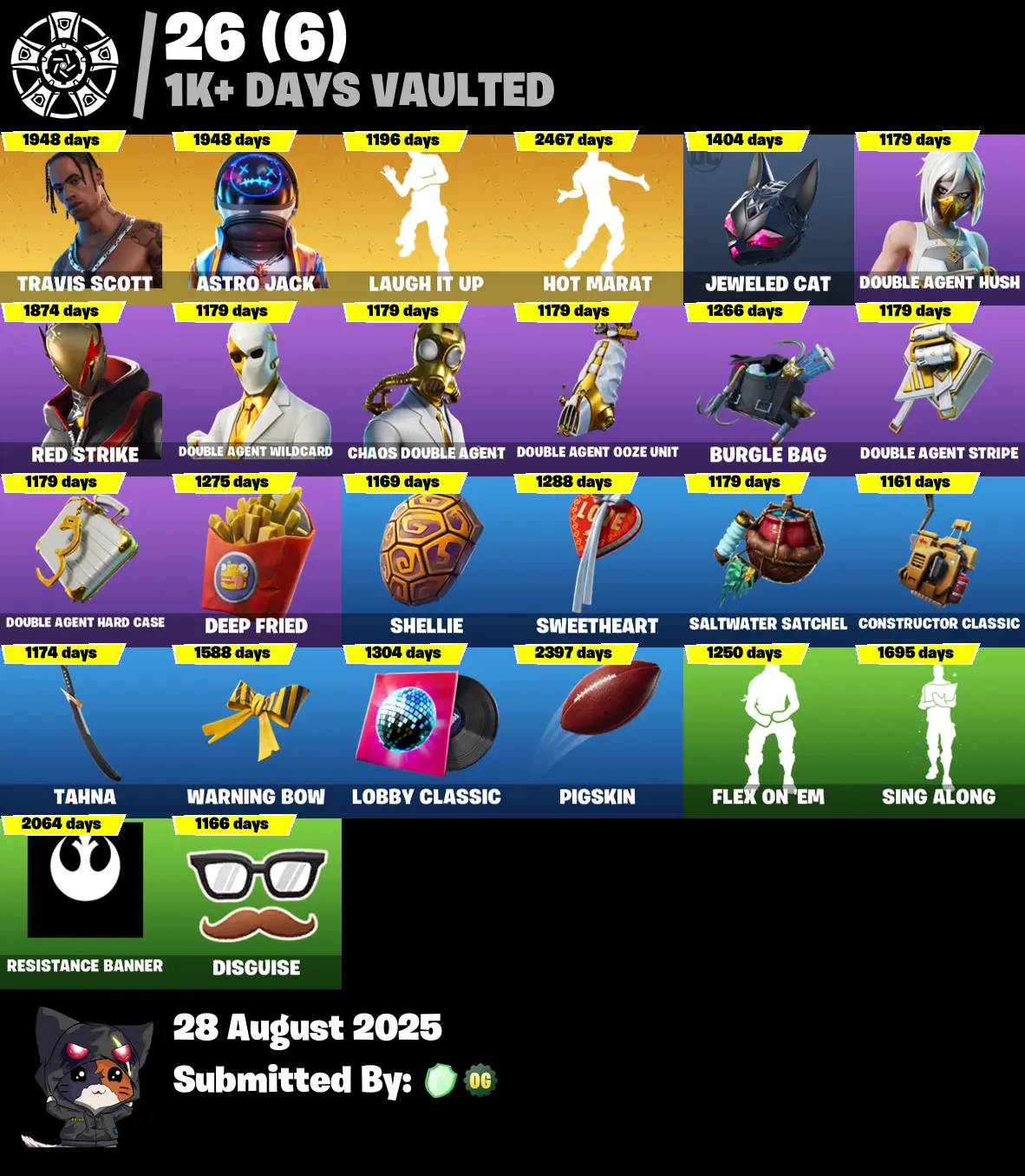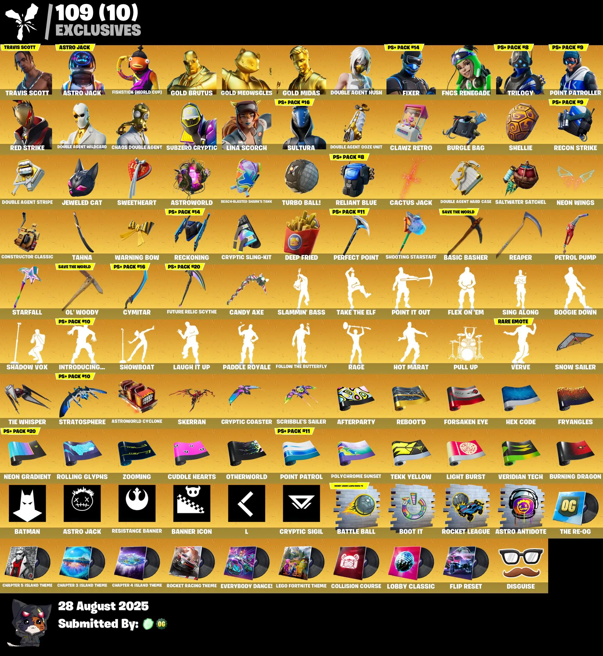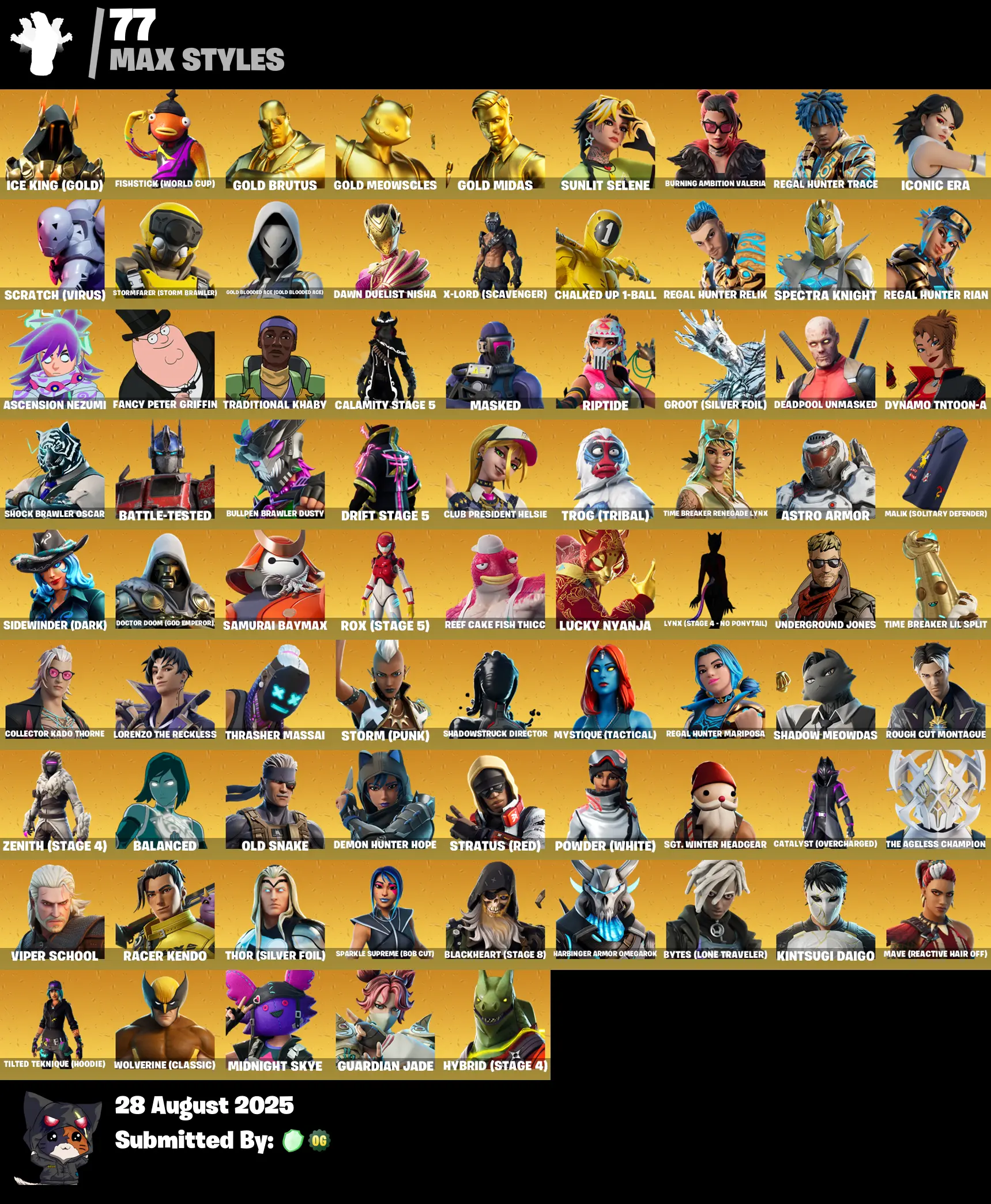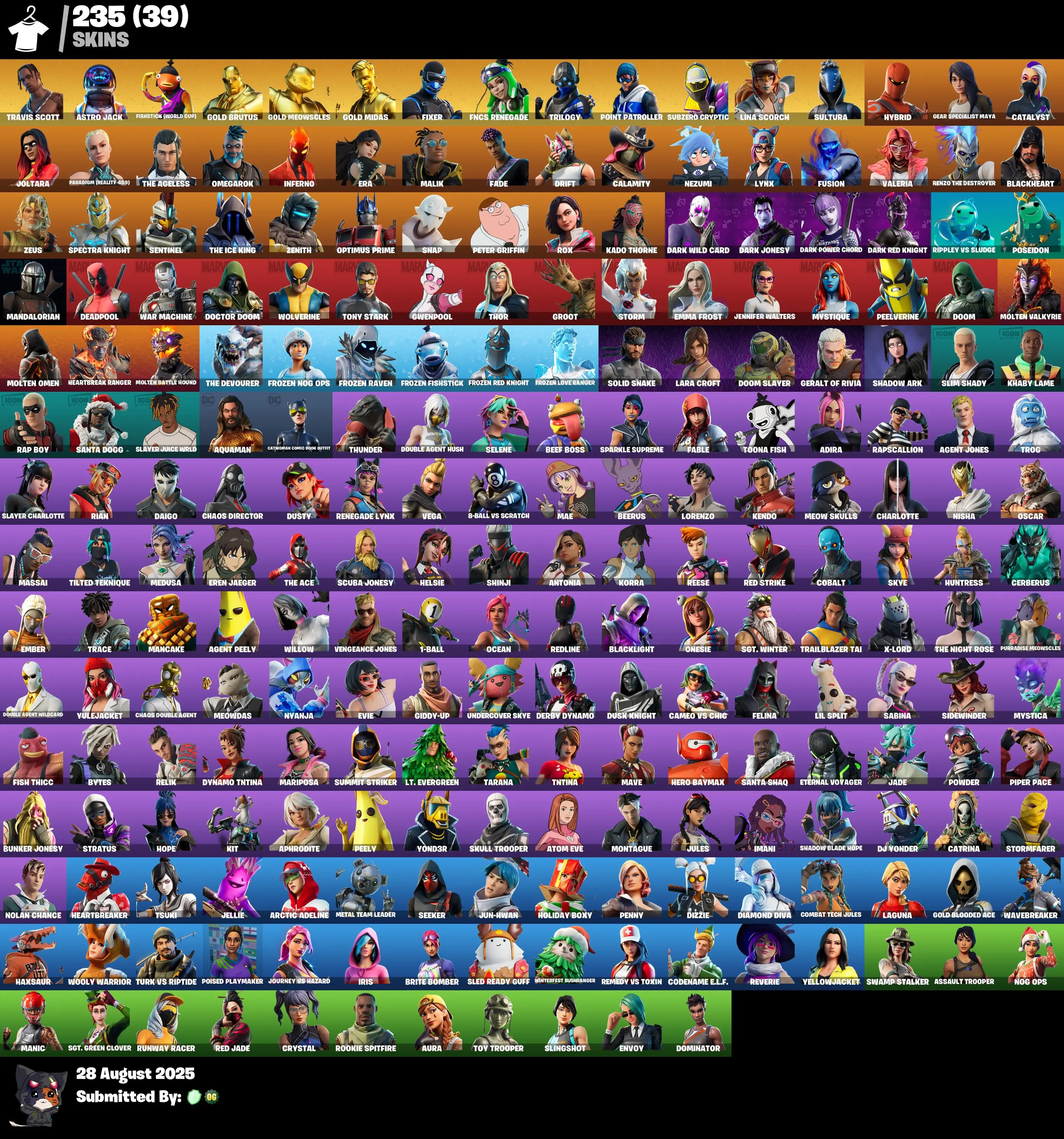🎉 [PC/PSN/XBOX] 235 SKINS | TRAVIS SCOTT, ASTRO JACK, FISHSTICK (WORLD CUP), GOLD BRUTUS, GOLD MEOWSCLES, GOLD MIDAS, FNCS RENEGADE, SUBZERO CRYPTIC, LINA SCORCH, JOLTARA, PULL UP, DOUBLE AGENT HUSH, LAUGH IT UP, HEY NOW, LAST FOREVER