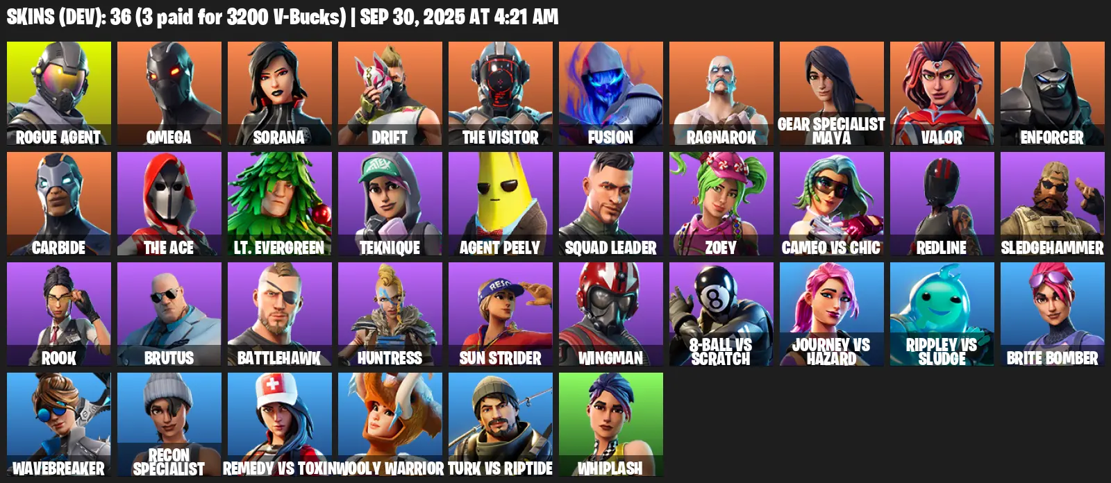 [PC/PSN/XBOX] | 36 skins | 600 V-bucks | Omega | Rogue Agent | Sorana | Drift | The Visitor | Fusion | Ragnarok | Gear Specialist Maya | Valor | S4G