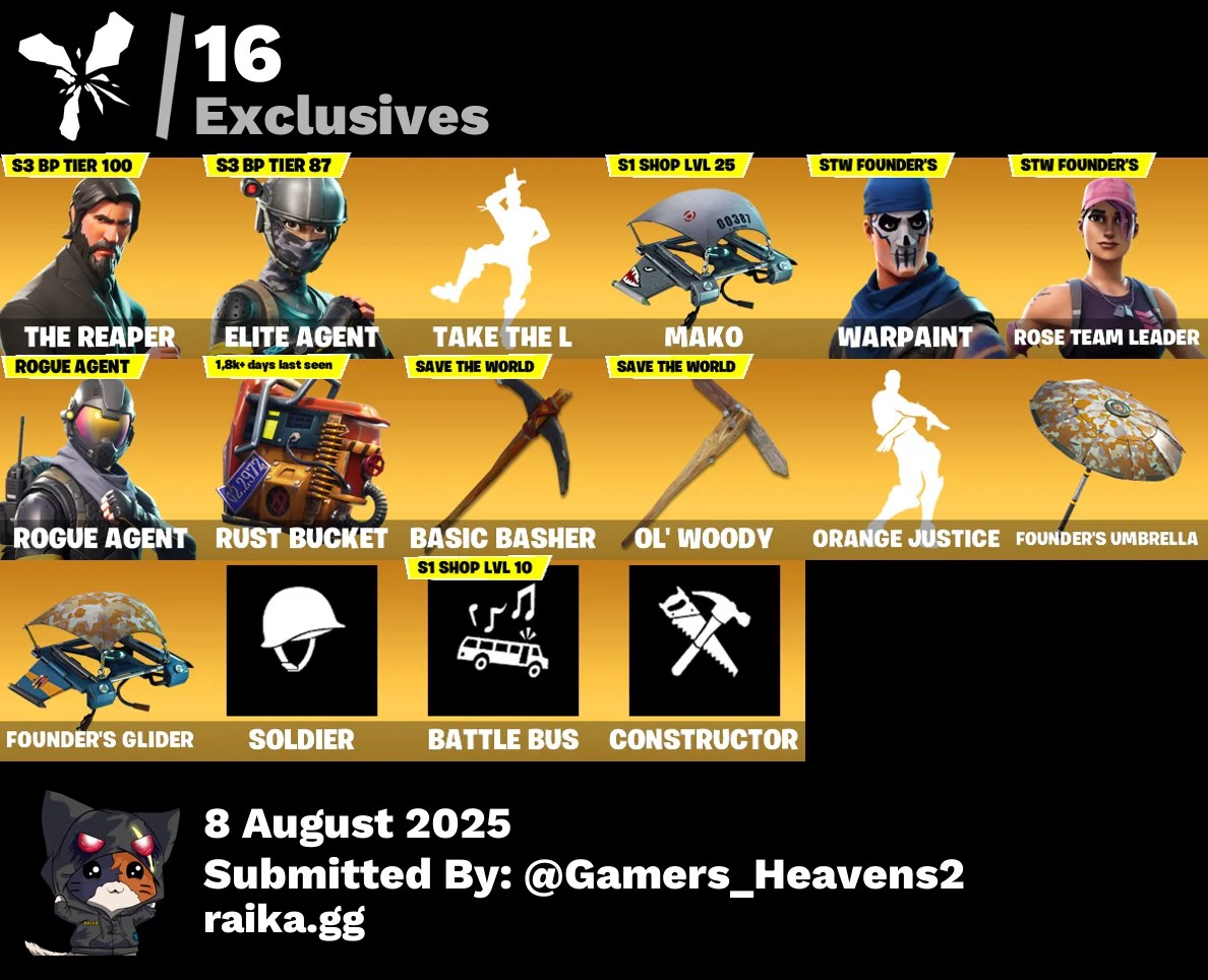 [PC/PSN/XBOX] 40 skins | OG STW | The Reaper | Elite Agent | Rogue Agent | Rust Bucket | Ol' Woody | Basic Basher | Take The L | Orange Justice | Mako | 1400 VB