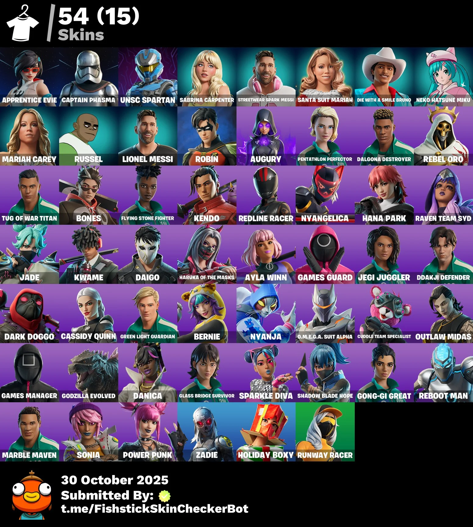 [PC/PSN/XBOX] 54 skins | Apprentice Evie | Captain Phasma | UNSC Spartan | Sabrina Carpenter | Streetwear Spark Messi | Santa Suit Mariah | 3550 VB