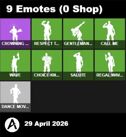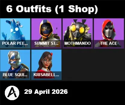 | PC/PSN/XBOX | 6 Skins | Polar Peely | Summit Striker | Mothmando | The Ace | Blue Squire | Krisabelle | Blade of the Waning Moon | Nanner Bashers | Holly Hatchets | Snowplower | Crescent Shroom