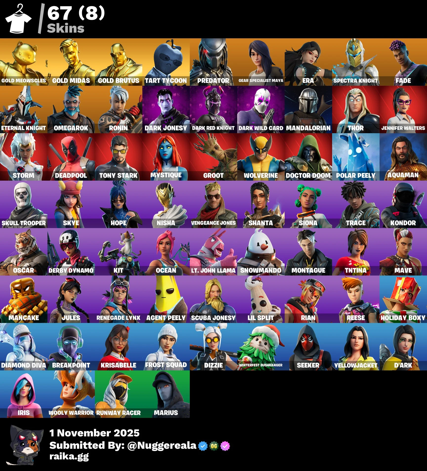 [PC/PSN/XBOX] 67 skins | Gold Meowscles | Gold Midas | Gold Brutus | Tart Tycoon | Predator | Gear Specialist Maya | Era | Spectra Knight | Fade | 950 VB