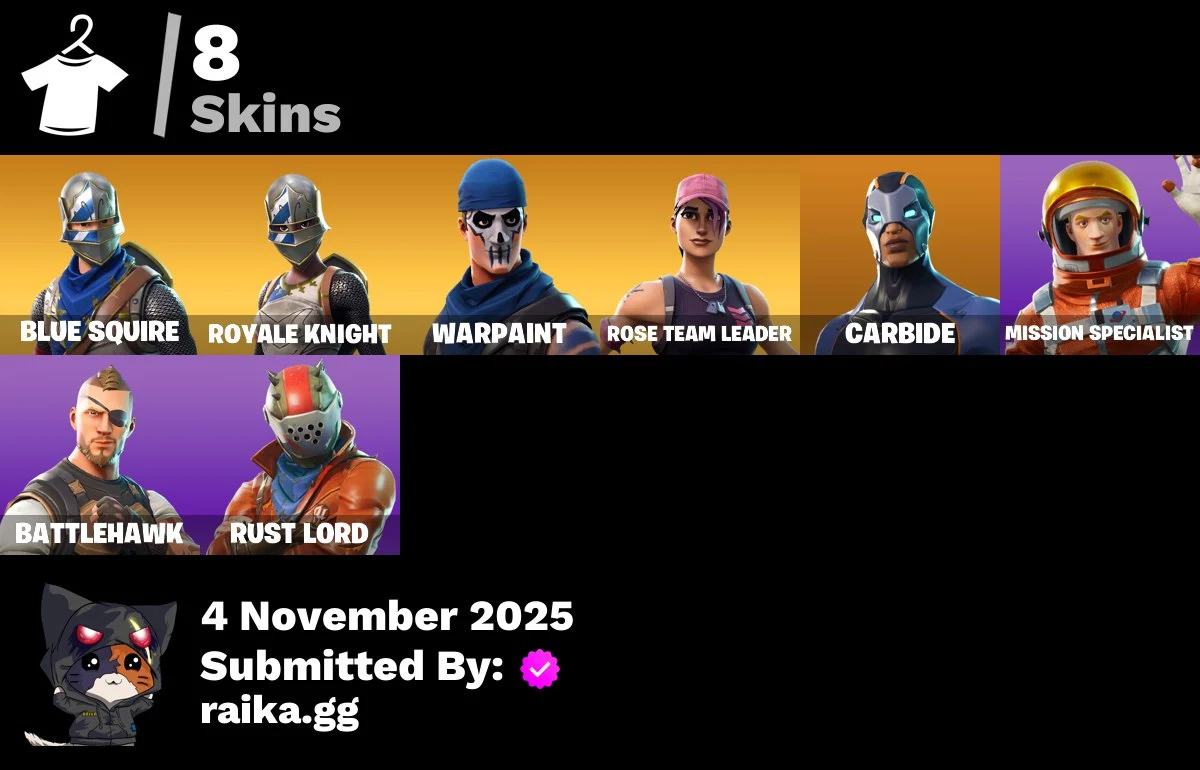 [PC/PSN/XBOX] 8 skins | OG STW | Blue Squire | Royale Knight | Carbide | Mission Specialist | Battlehawk | Rust Lord | Skirmish | Pursuit | Squire Shield | 2000 VB