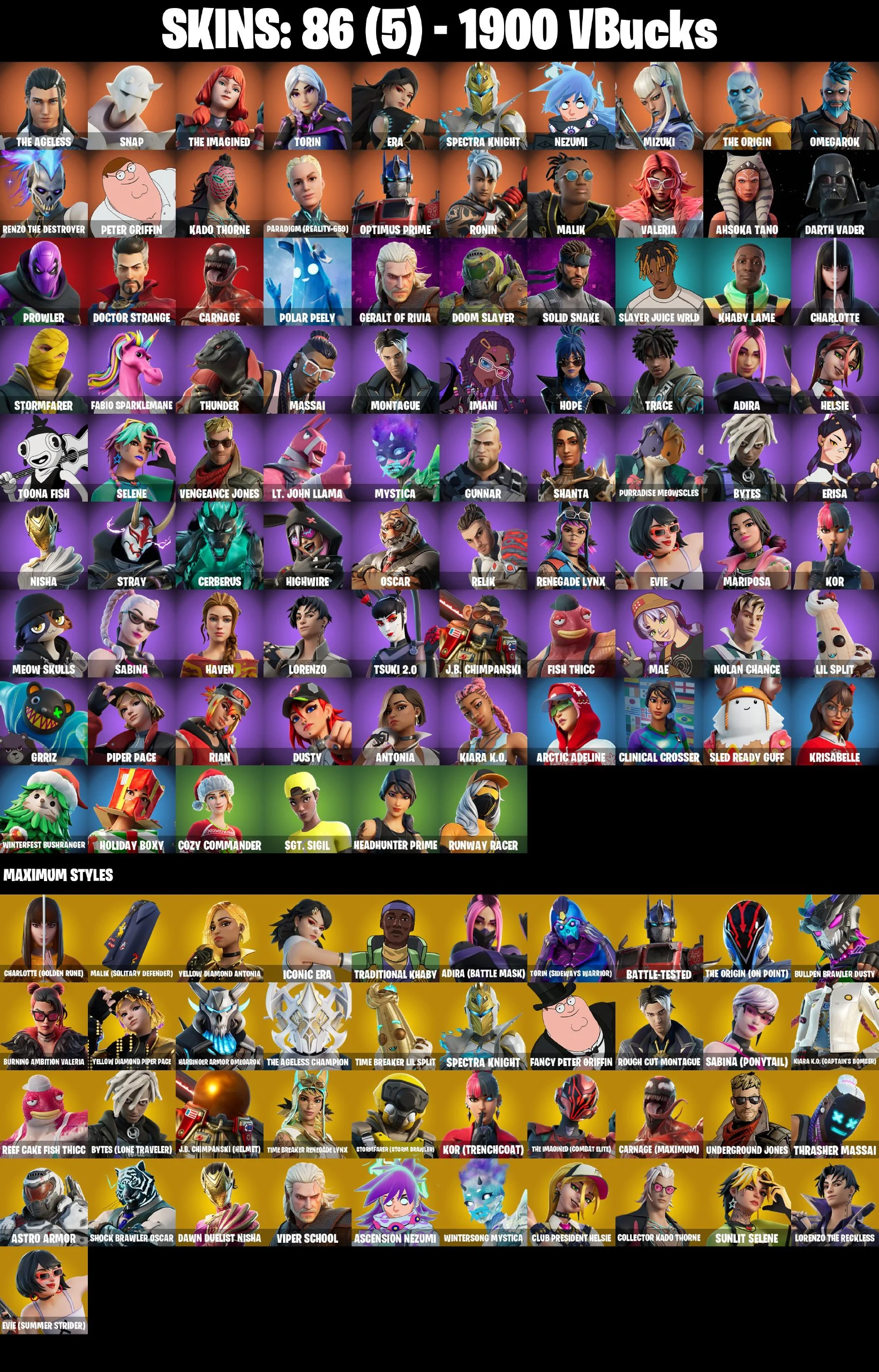 ⭐ [PC/PSN/XBOX/NINTENDO/MOBILE] 86 SKINS | DARTH VADER | CARNAGE | DOCTOR STRANGE | CHARLOTTE | TOONA FISH | HELSIE | HIGHWIRE | NISHA | KOR | MEOW SKULLS | CLINICAL CROSSER | 1900 VBUCKS | EMAIL