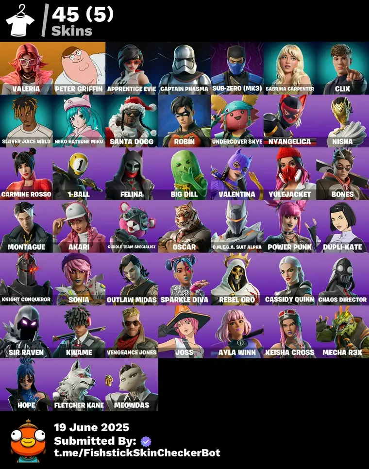 【PC/PSN/XBOX/SWITCH】 45 Skins | Valeria | Peter Griffin | Captain Phasma | Apprentice Evie | Sub-Zero (MK3) | Neko Hatsune Miku | Santa Dogg | Sabrina Carpenter | 1100 VB | FS35