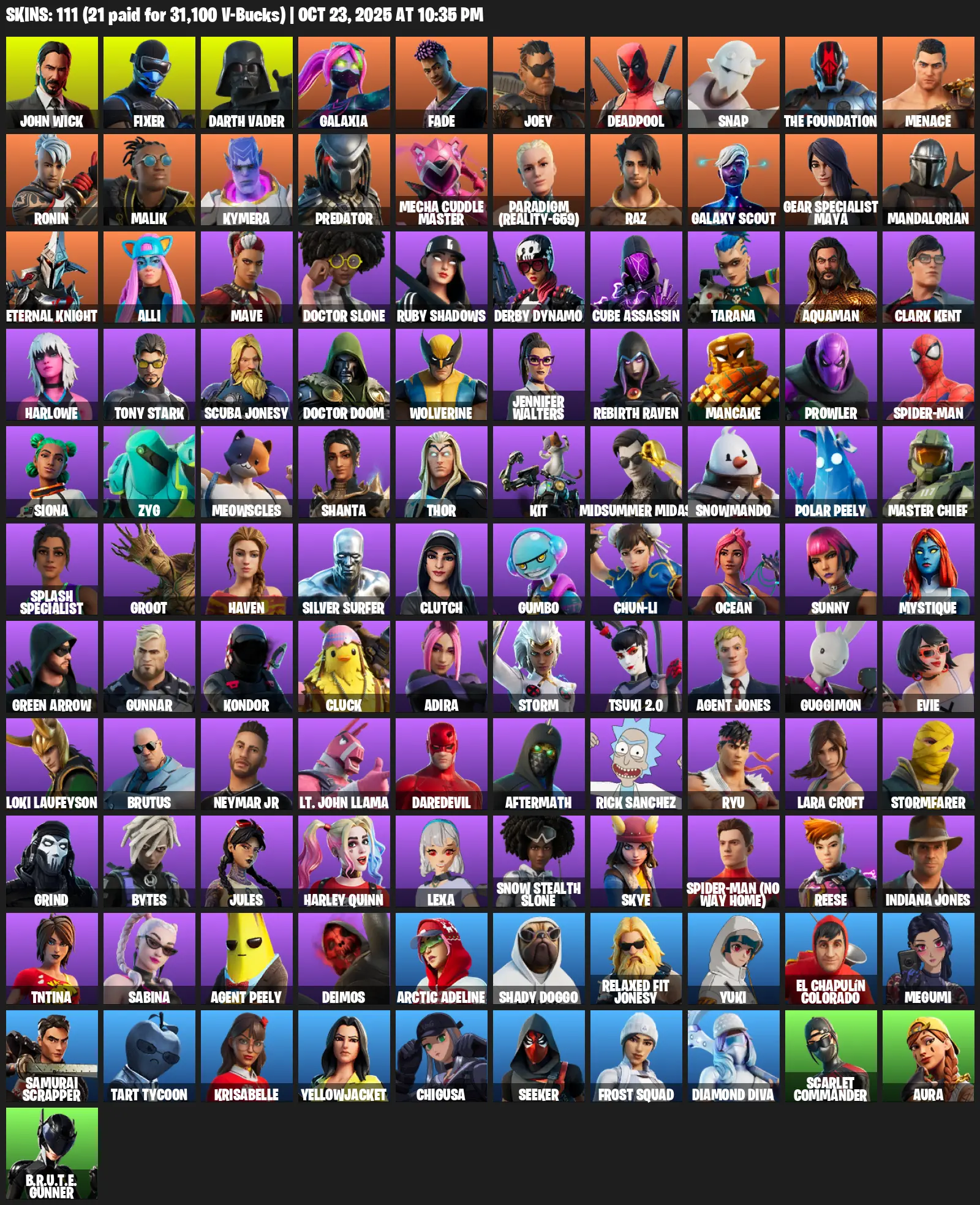 [PC/XBOX] | 111 skins | Leviathan Axe | Lara Croft | John Wick | Fixer | Darth Vader | Galaxia | Fade | Joey | Deadpool | Snap | #PEL0499 | #MBFN
