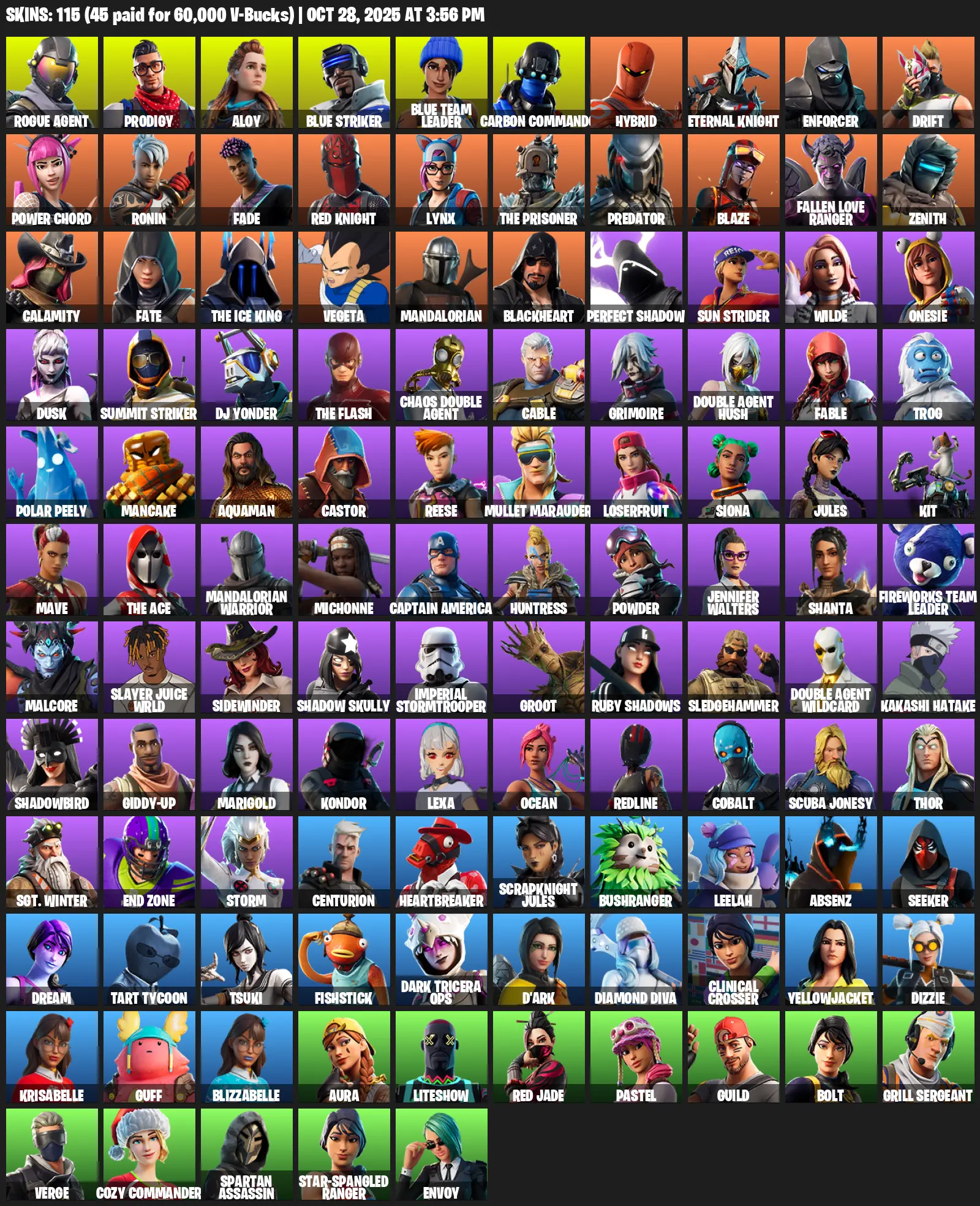 [PC/XBOX] 115 Skins | Rogue Agent | Prodigy | Aloy | Blue Striker | Blue Team Leader | Carbon Commando | Hybrid | Eternal Knight | Enforcer | Drift | Power Chord | Ronin | Fade | Red Knight | Lynx | The Prisoner | Predator | Blaze | Fallen Love Ranger