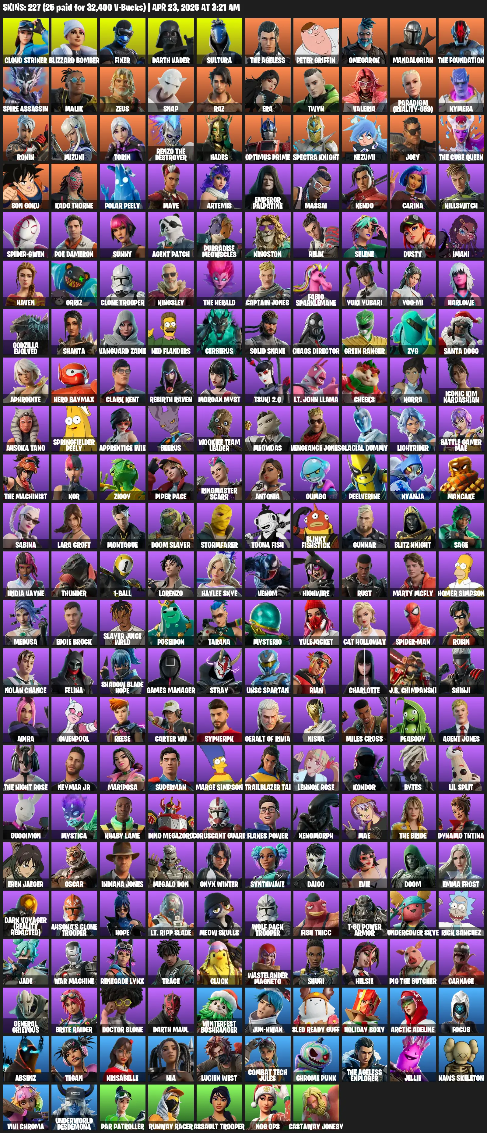 [PC/XBOX] | 227 skins | Lara Croft | Cloud Striker | Blizzard Bomber | Fixer | Darth Vader | Sultura | The Ageless | Peter Griffin | #IHC7822