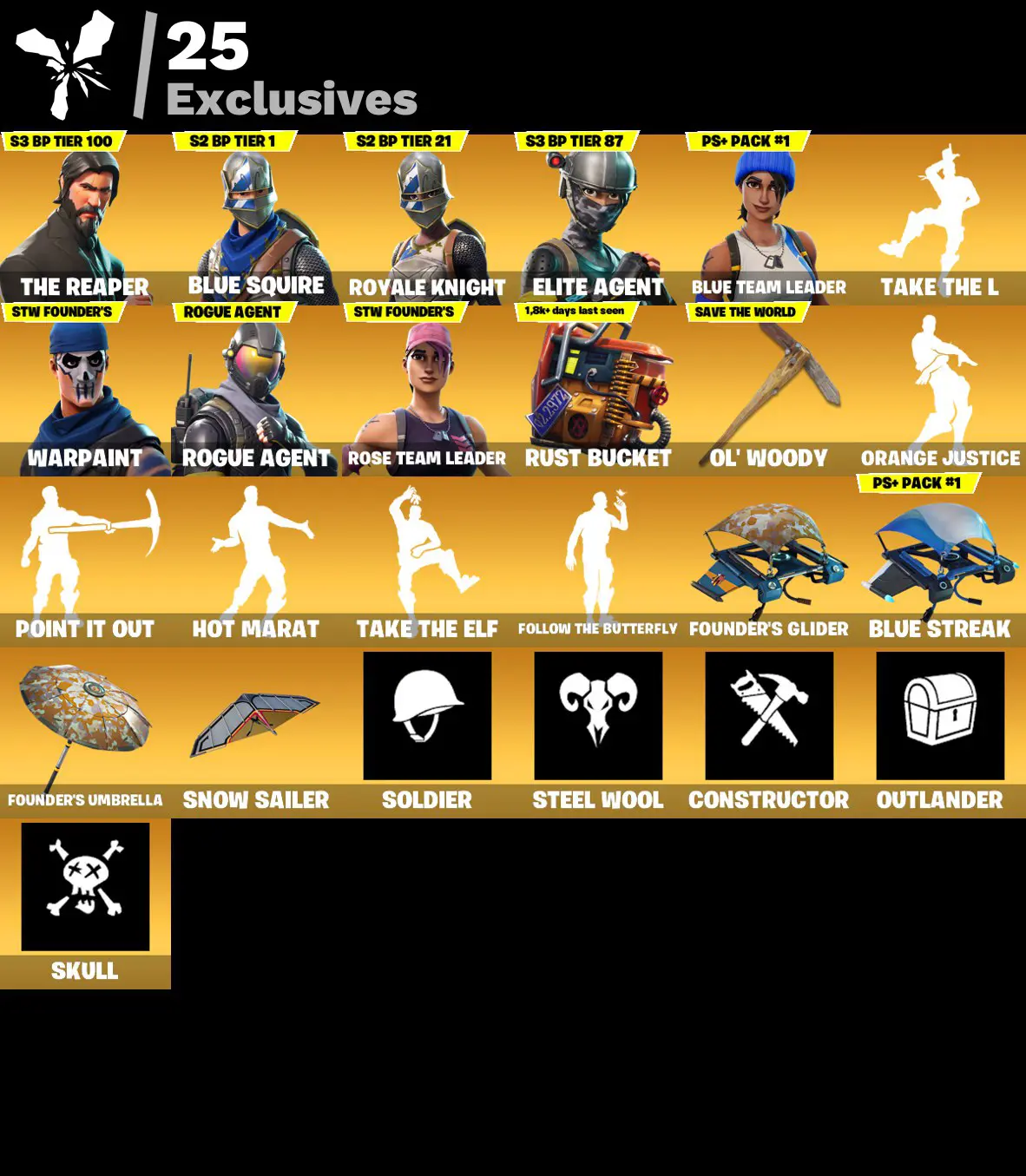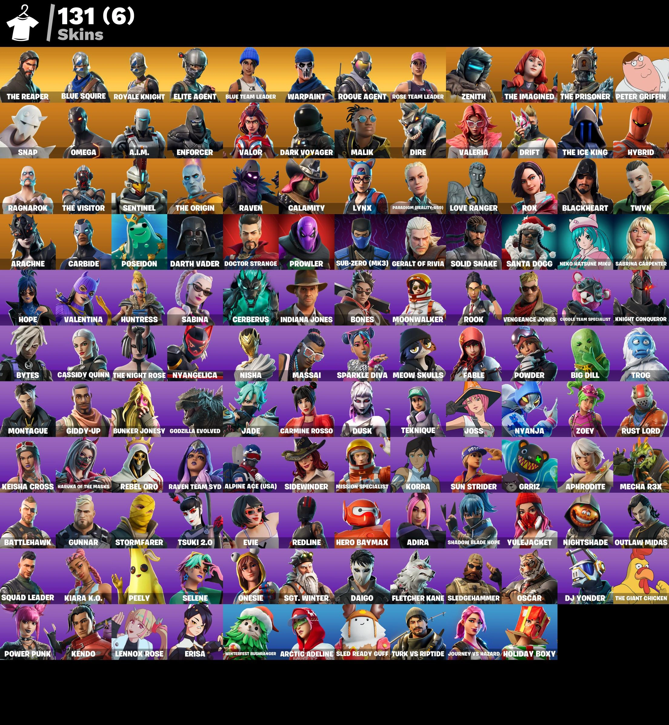 [PC/XBOX/PSN] 131 Skins 💜 Royale Knight 💜 The Reaper | Blue Squire | Elite Agent | Blue Team Leader | Rogue Agent | Rust Bucket | OG STW | 1850 VB