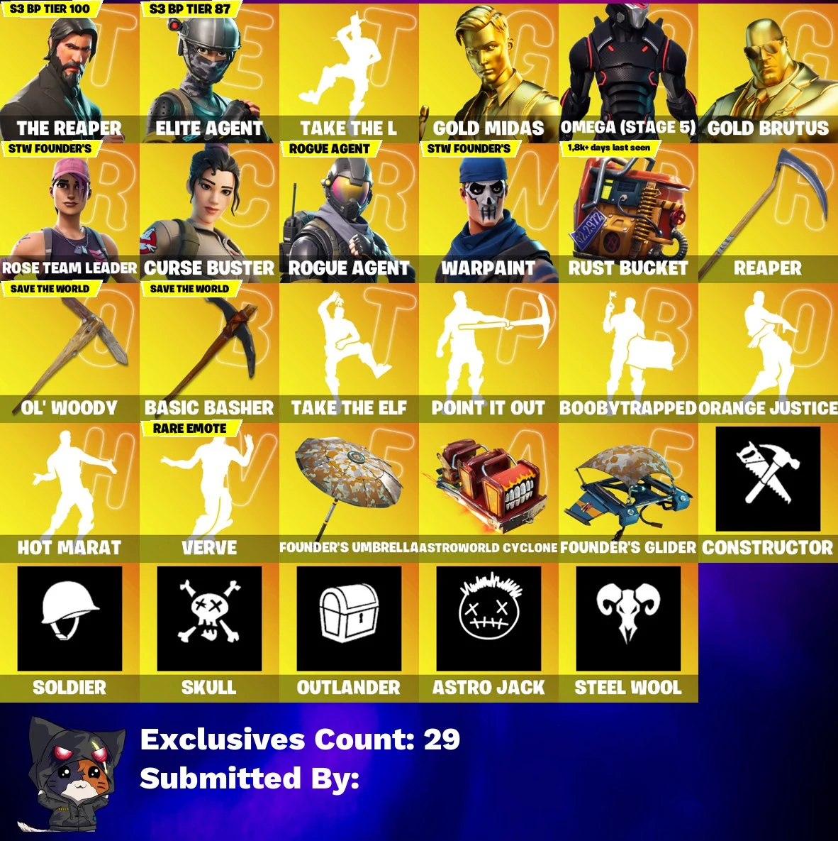 🎒🔥 STACKED OG ACCOUNT 🔥🎒 186 SKINS 💎 THE REAPER 💎 TAKE THE L 💎 ELITE AGENT 💎 CURSE BUSTER 💎 GOLD MIDAS 💎 OMEGA (STAGE 5) 💎 GOLD BRUTUS 💎 ROGUE AGENT 💎 LUXE 💎 DARK VOYAGER 💎 DIRE 💎 LYNX 💎 VALERIA 💎 SPECTRA KNIGHT 💎 VALOR 💎 1925 VB 💎 OG STW 💎 FULL ACCESS 💎