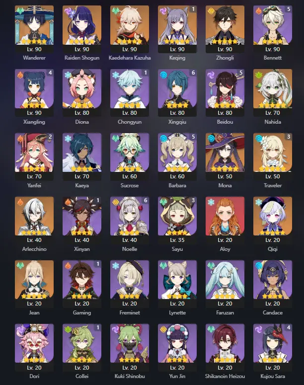 AR56 / Asia {13X 5 STAR LEGENDS} Wanderer + WP / Raiden + WP / Nahida + WP / Kazuha / Zhongli / Keqing c1 / {5-WEAPON} mssh1054