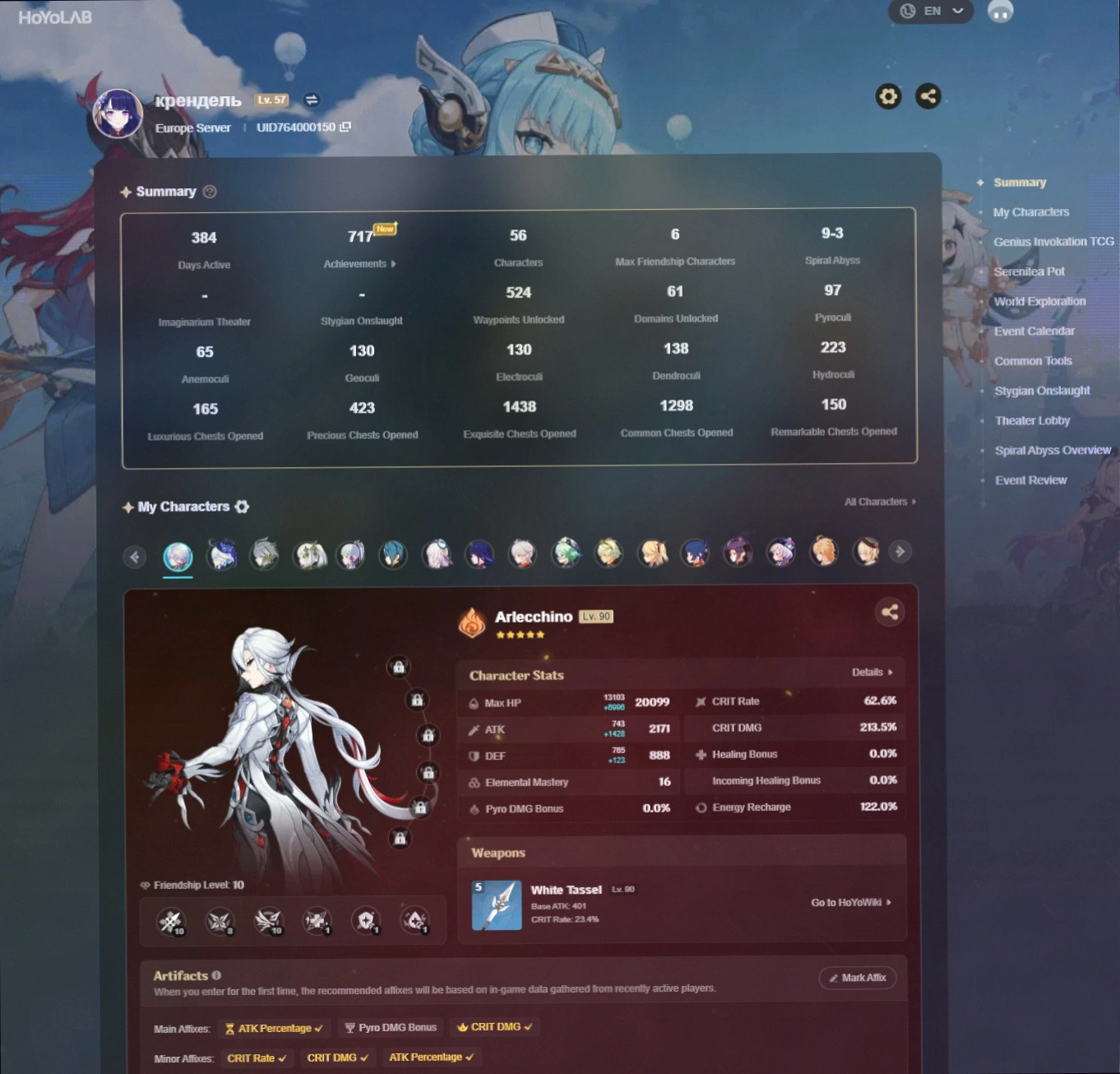 [EU HANDLEVELED] AR 57 + 12 EVENT LEGS + Citlali+Arlecchino+Furina+Alhaitham+Nahida+Ayaka+Kazuha+Raiden+Albedo+Mona C3+Keqing C1 + FULL ACCESS + EMAIL #ACC-167247