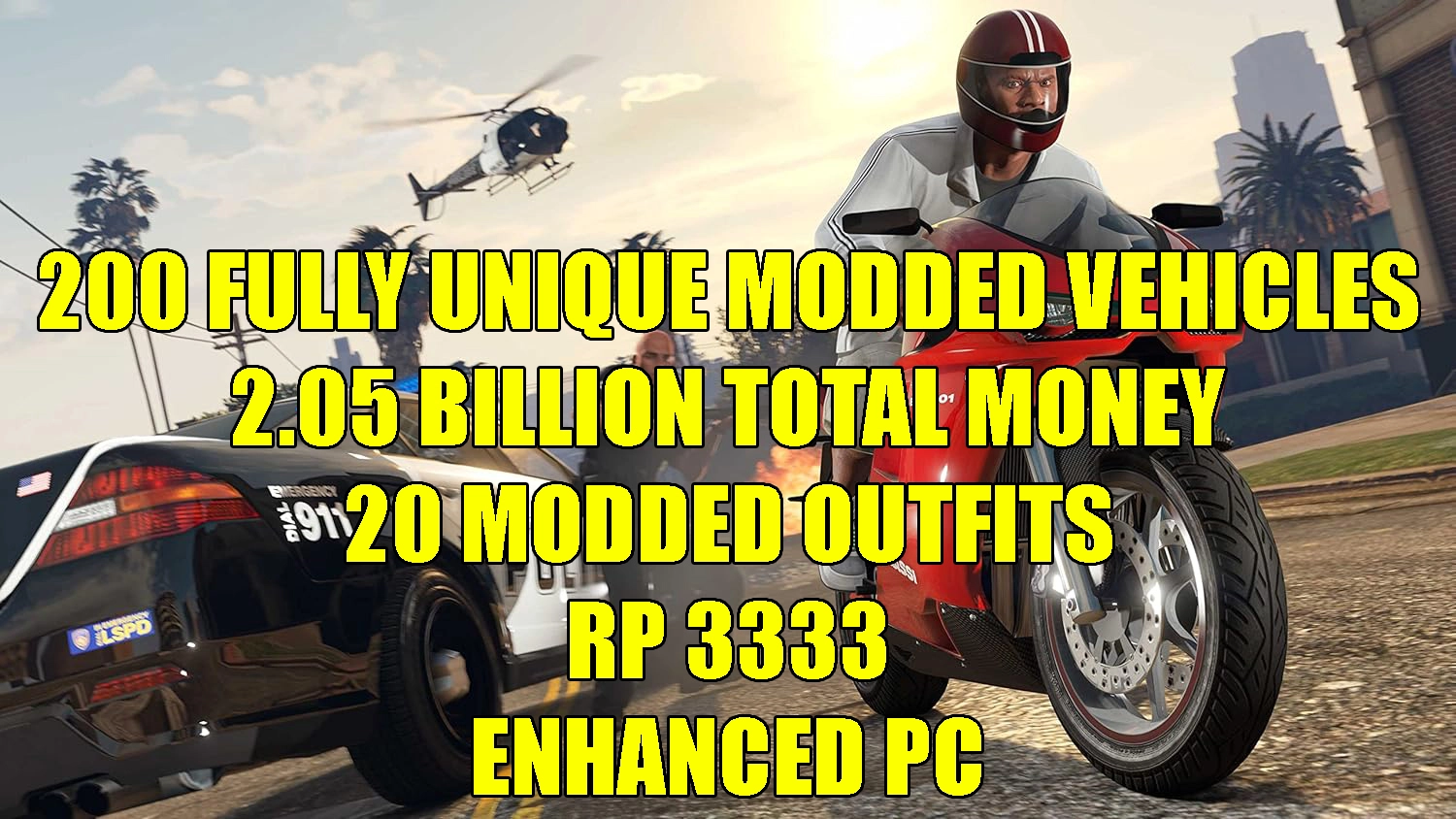 ENHANCED | PC | 200 FULLY UNIQUE MODDED VEHICLES + 2.05 BILLION TOTAL MONEY | 2B FROZEN KD | 20 MODDED OUTFITS | LVL 3333 | FAST RUN | ALL UNLOCKS
