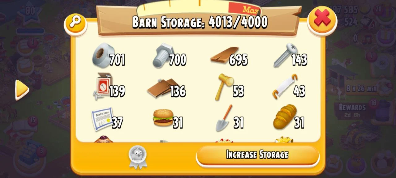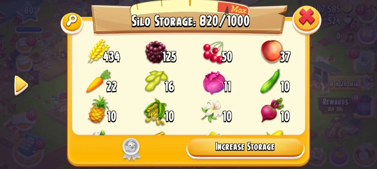✨️ CHEAPEST LEVEL 80 HAY DAY FARM 🌾 4187585 COINS🪙 4013/4000 BARN STORAGE💪 820/1000 SILO STORAGE🎯 524 GEMS💎 SUPPORTS BOTH iOS&Android✅️ INSTANT DELIVERY 🚚