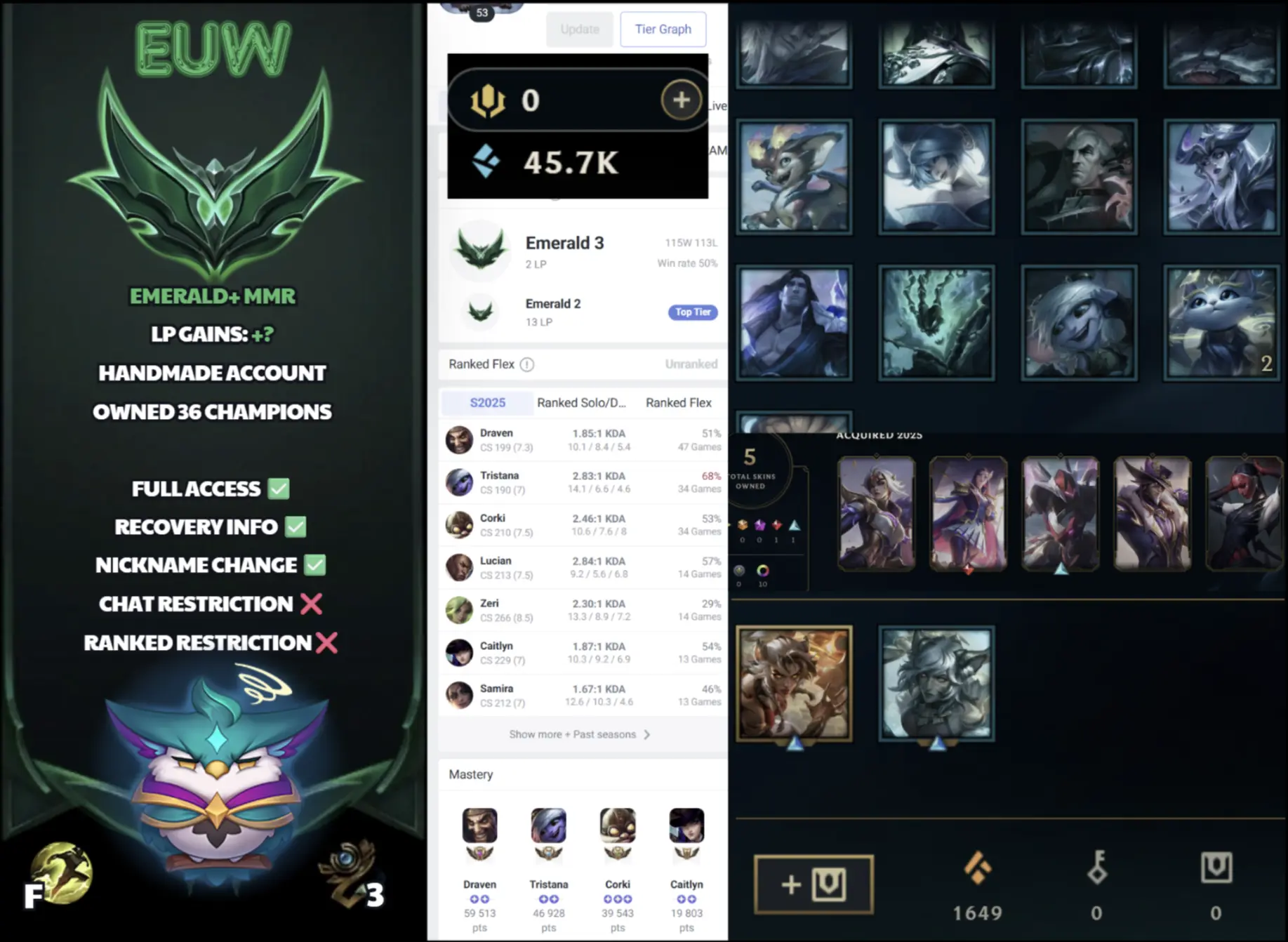 🌍 EUW 🔒 Handlevel ⚡ Emerald IV (76 LP) ✨ WR:50% 🔥 37 Champs + 5 Skins ♾️ Lifetime Ownership 📧 Full Access Account ✅ #SBL-Z9J