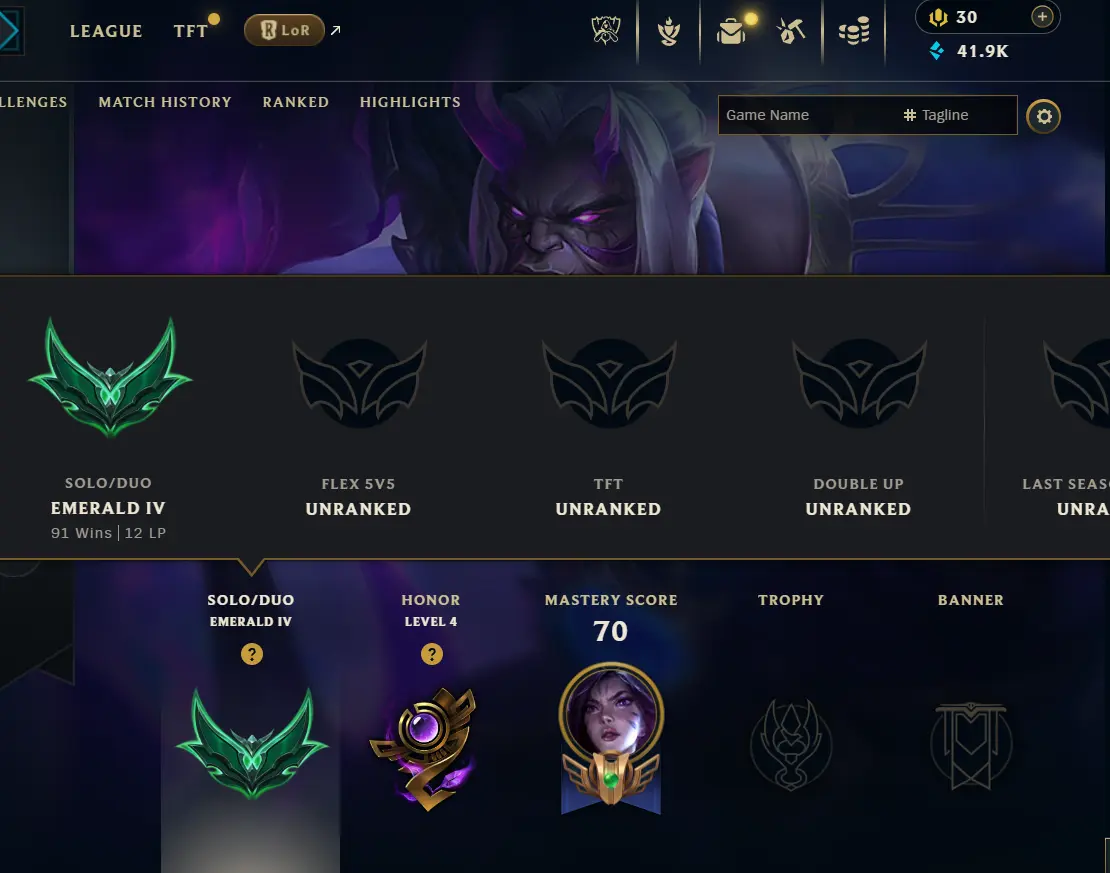[ 🔥NA S15 SPLIT 3 ] EMERALD 4 [12LP] ✅️ HANDLEVELED✅️58%WR✅️(91W65L) ✅️SUPP/ADC Main ✅️ Flash: D✅️BE: 41,000✅️ Honor 4✅️ CHANGEABLE RIOT ID