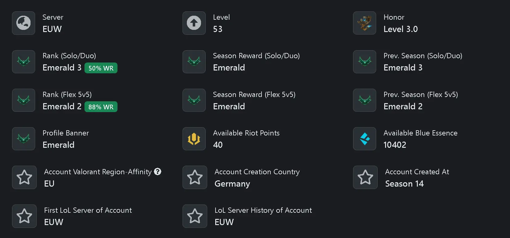 🌎 Region: EUW🔱S15SP3 EMERALD III🔱PRESTIGE MASQUE OF THE BLACK ROSE KATARINA-DUNKMASTER DARIUS❄ High Quality LOL Account ⸱ 💎10K B.E ✅️Changeable Email ✅️ 38 champions🔱14 skins 🔱 ⸱ ✈Instant Delivery⭐FLANKESSTORE⭐