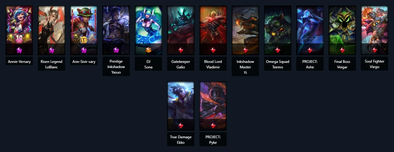 UnRanked┃92 skins┃171 Champs┃(4 Mythic) Prestige Inkshadow Yasuo PROJECT: Ashe Final Boss Veigar True Damage Ekko Gatekeeper Galio Blood Lord Vladimir Soul Fighter Viego