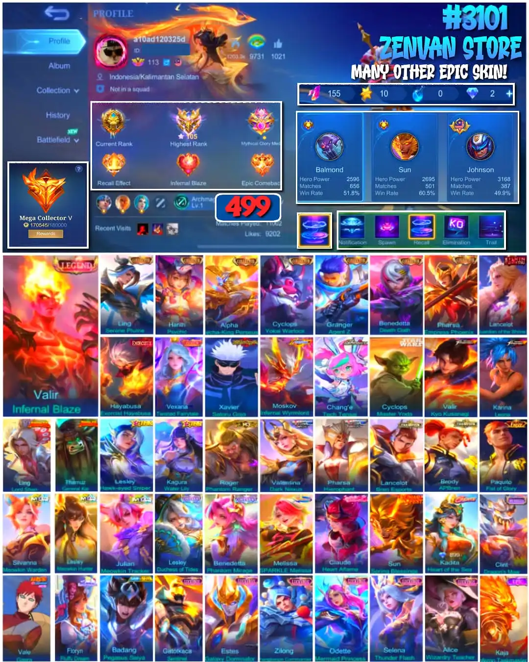 #3101 🔥 499 Skins 🔥 Legend Valir 🔥 Collector Ling, Harith, Benedetta & Pharsa 🔥 Exorcist Hayabusa 🔥 Gojo & Vexana 🔥 Internal Moskov 🔥 StarWars Cyclops 🔥 Kungfu Panda Ling & Thamuz 🔥 KoF Masha, Karina 🔥 Many Limited 🔥 Many Epic 🔥 Safe Account ✅
