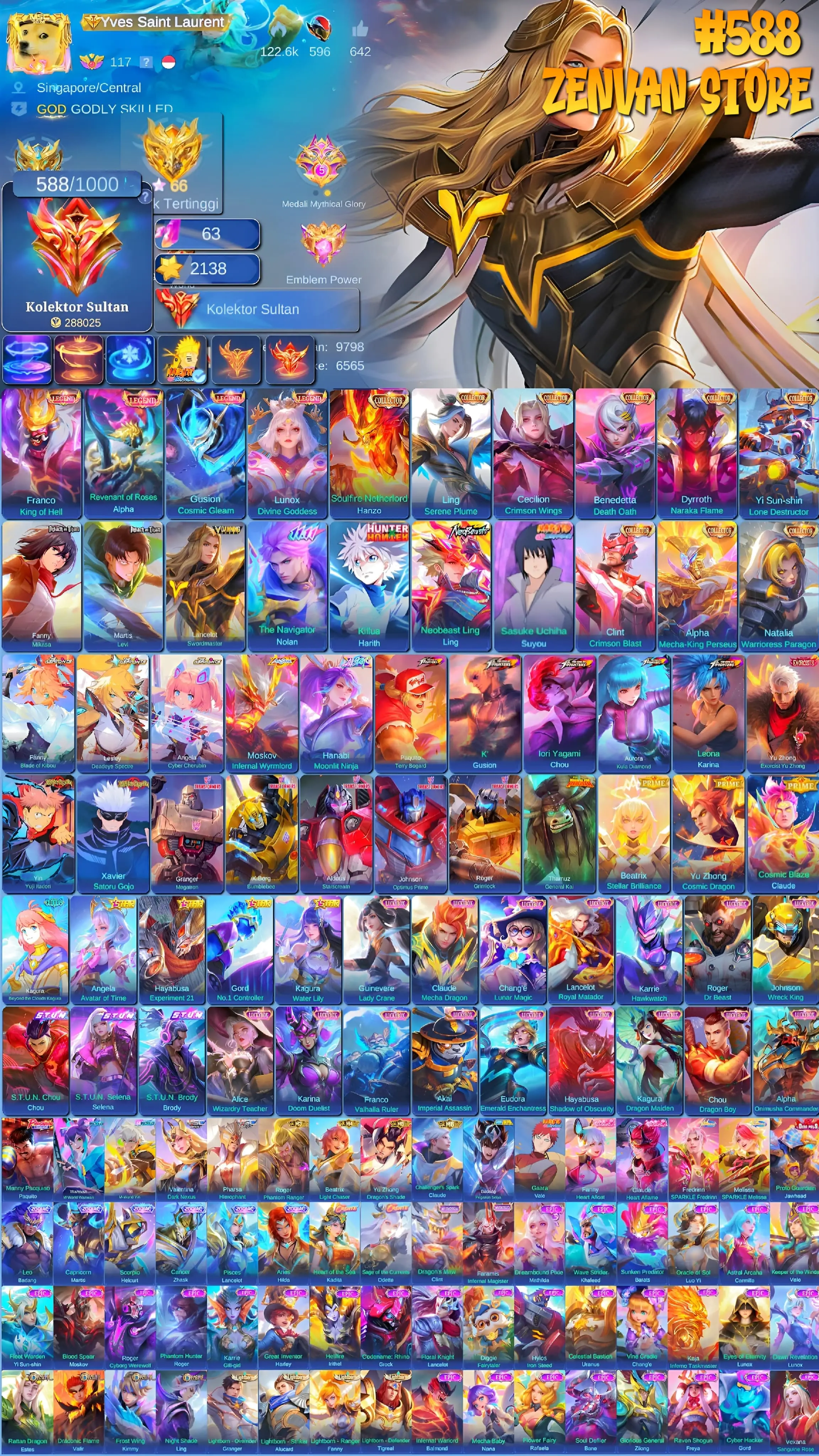 #588 🔥 588 Skins 🔥 Legends Franco, Gusion, Lunox & Alpha 🔥 Collector Hanzo, Ling, Cecilion, Benedetta, Dyroth, Yin Sun Shin, Natalia, Alpha & Clint 🔥 Attack on Titan Levi & Mikasa 🔥 🔥 Many Limited 🔥 Many Zodiak 🔥 Many Epic 🔥 Safe Account ✅