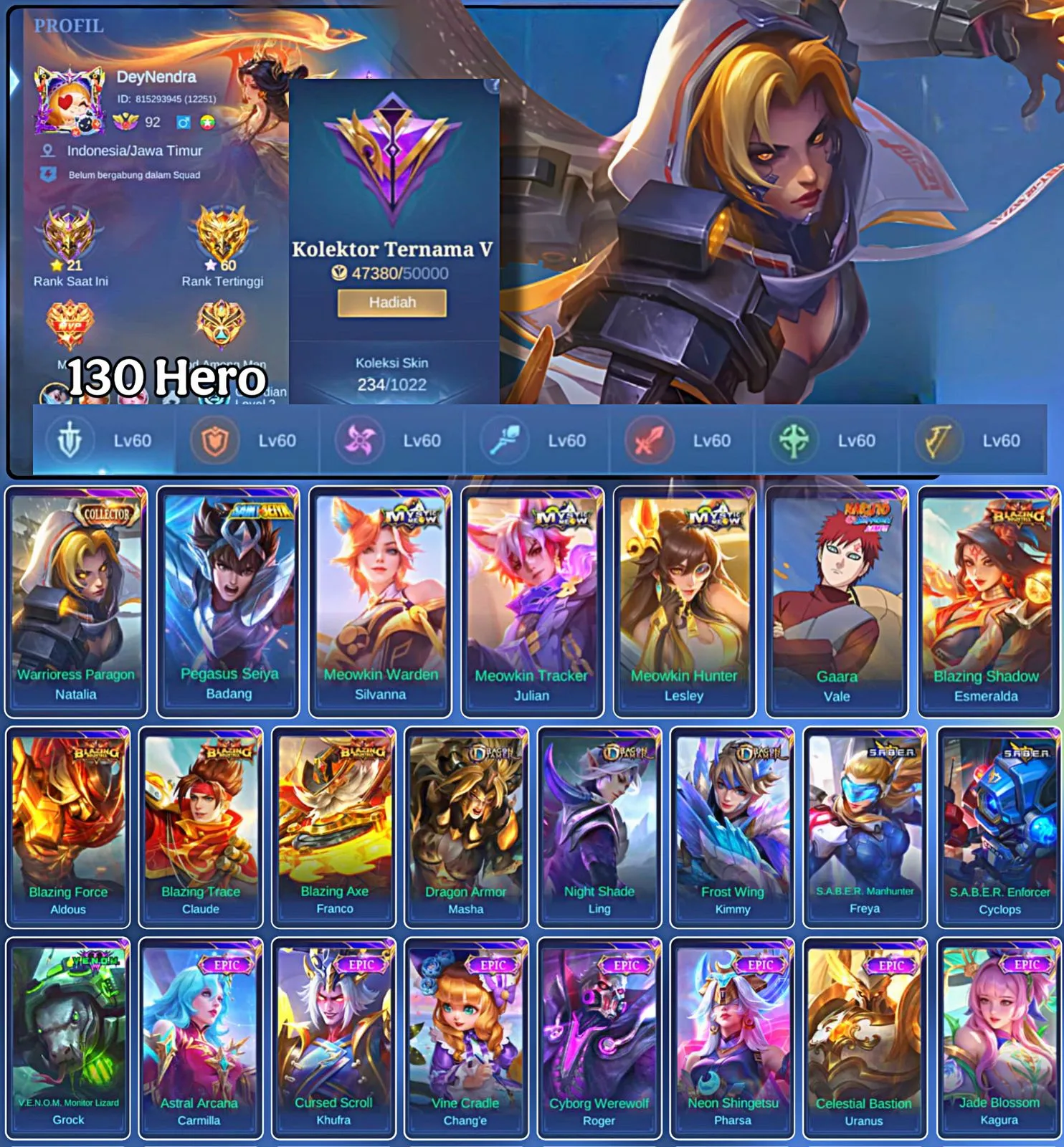 HERO 130 SKIN 234 | EMBLEM ALL MAX | COLECTOR NATALIA | VALE GARA | EPIC KHUFRA | EPIC URANUS | HERO GOOD | SKIN GOOD | INSTAN DELIVERY
