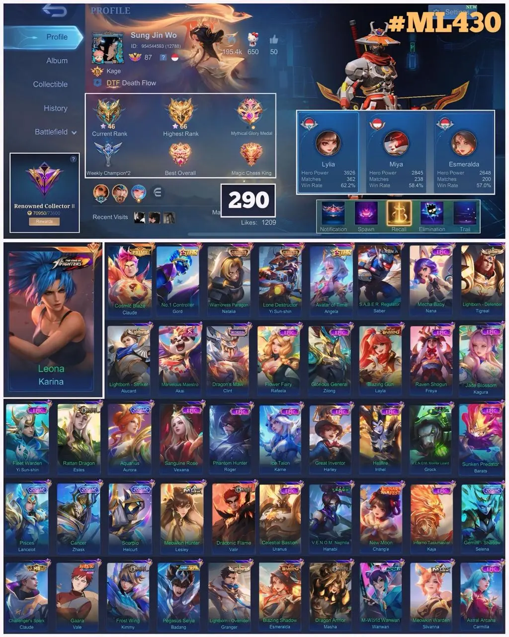 ML 430⚡Full max emblem⚡️Skins 290⚡️Hero 129⚡️Kof Karina⚡️Prime Claude⚡️Star Gord⚡️ Collector Natalia Yi Sunshin⚡️Star Angela⚡️15 Epic⚡️Lightborn Tigreal Alucard⚡️Myth Clint⚡️Blazing Layla⚡️Dragon Estes⚡️Zodiac Aurora Lancelot Zhask Helcurt Selena⚡️