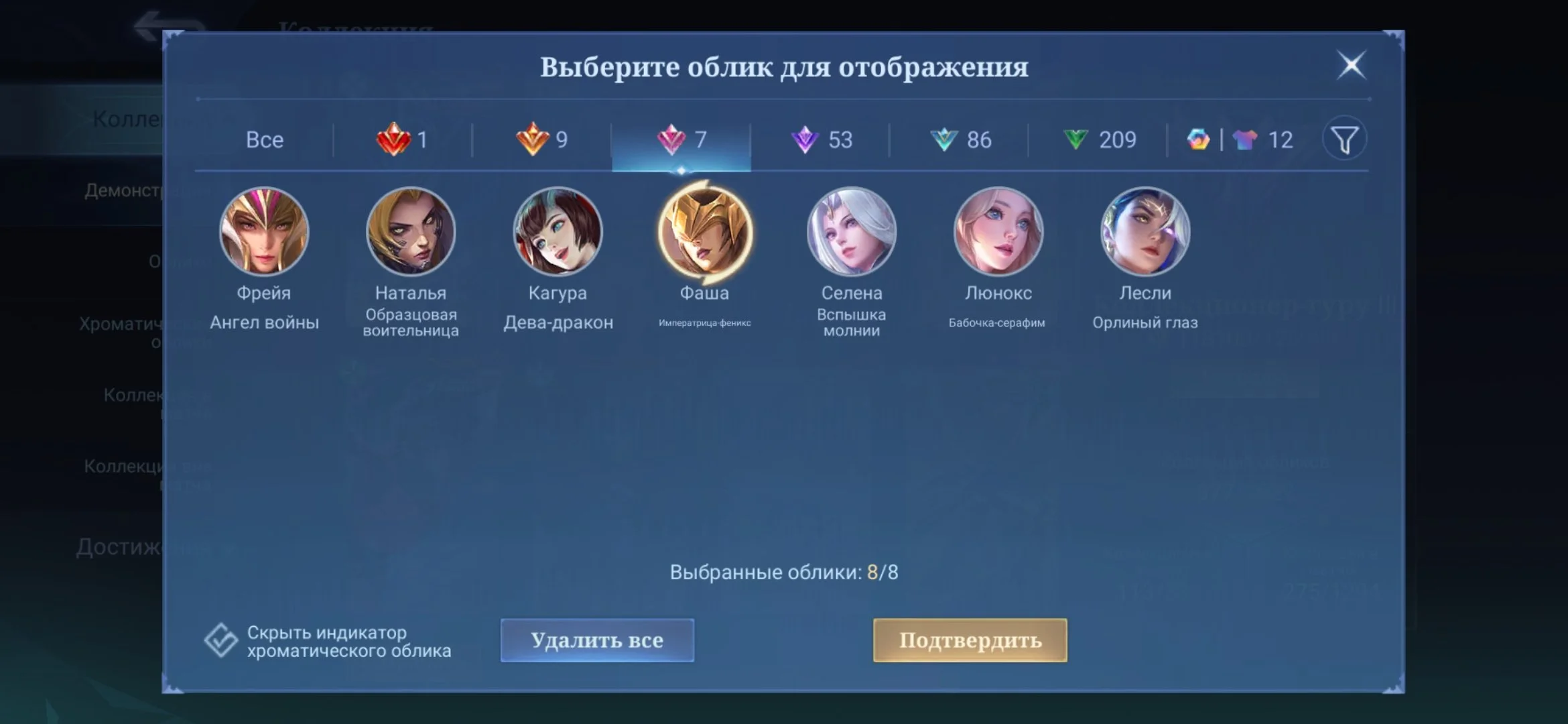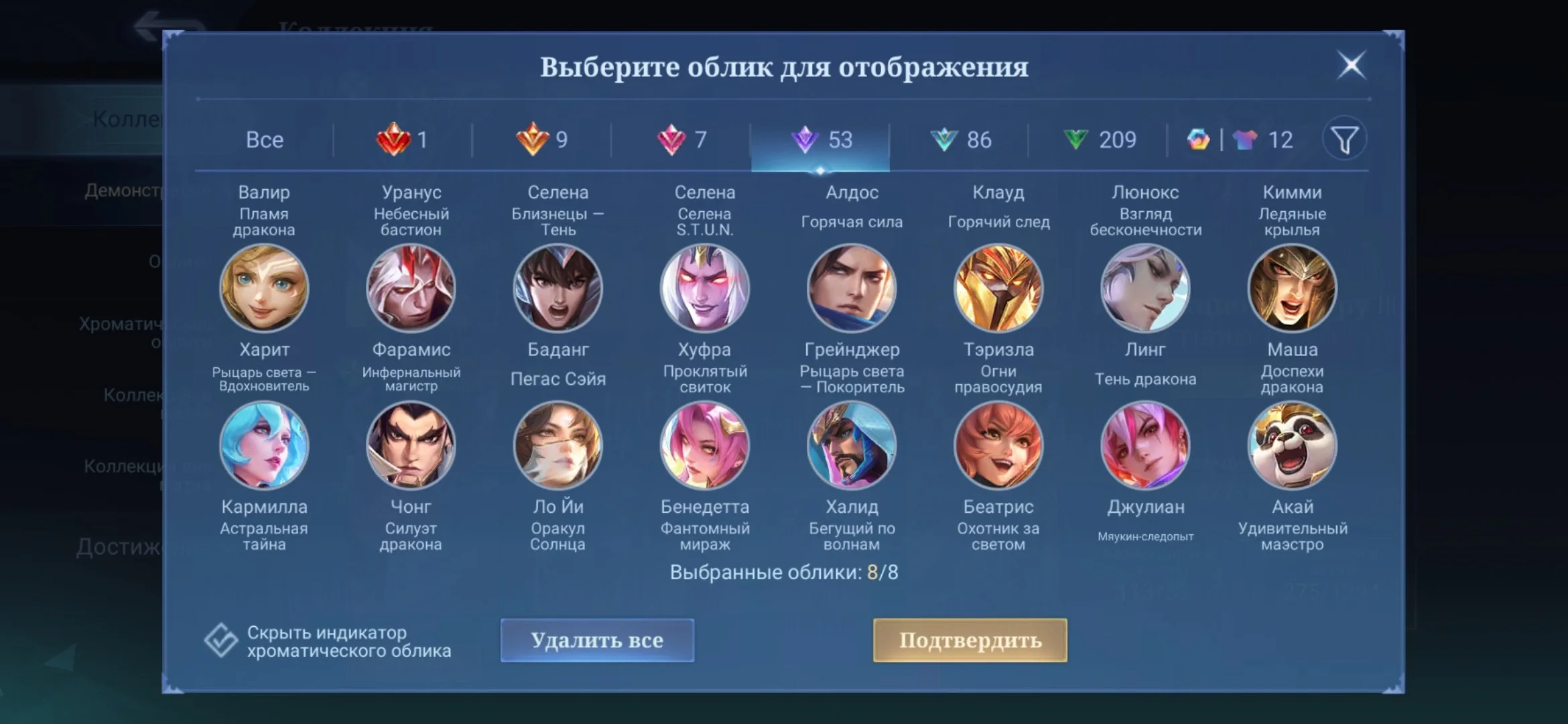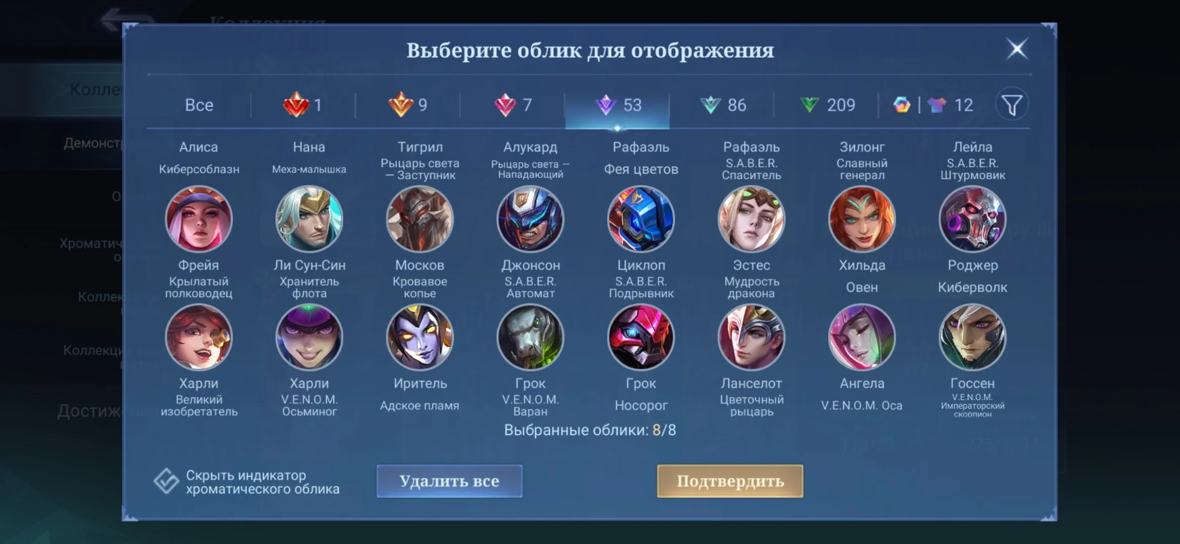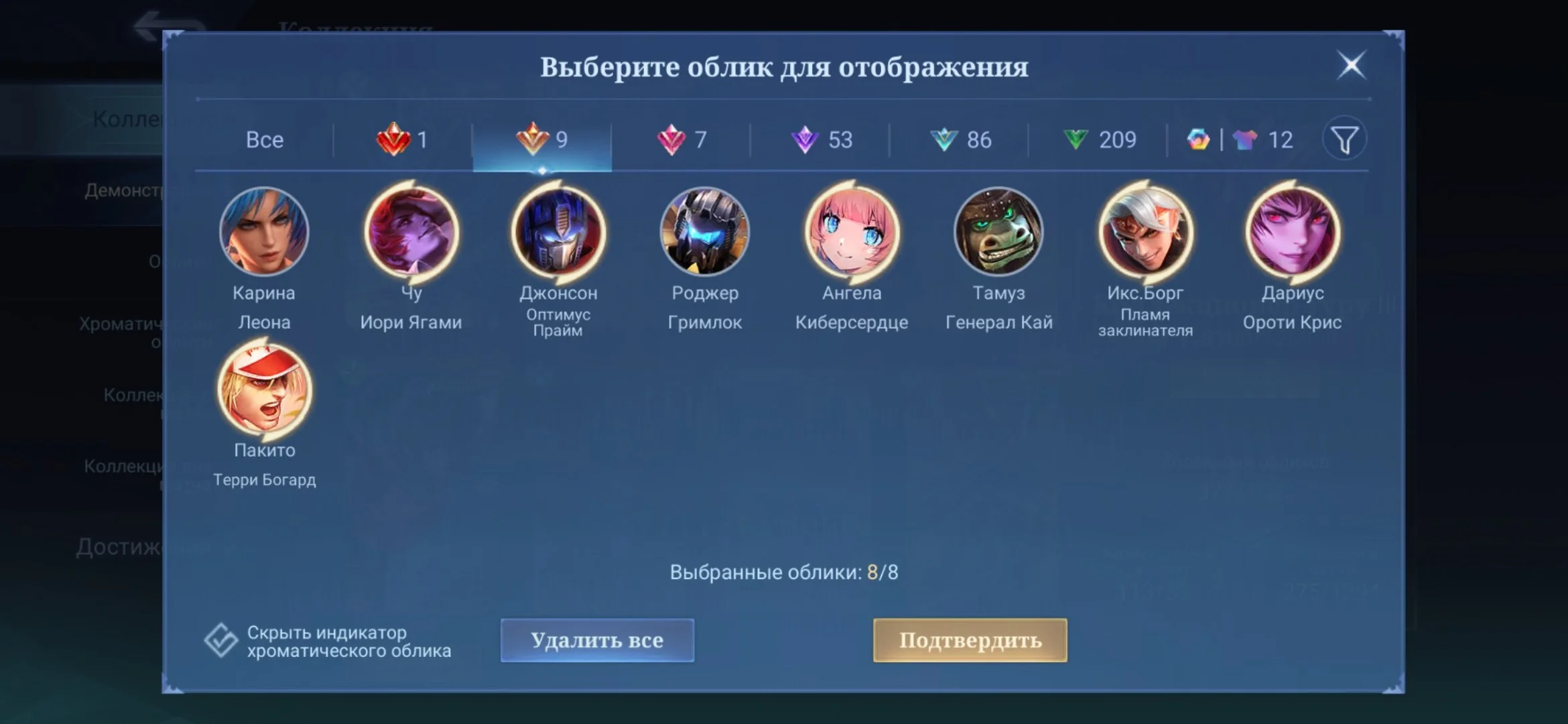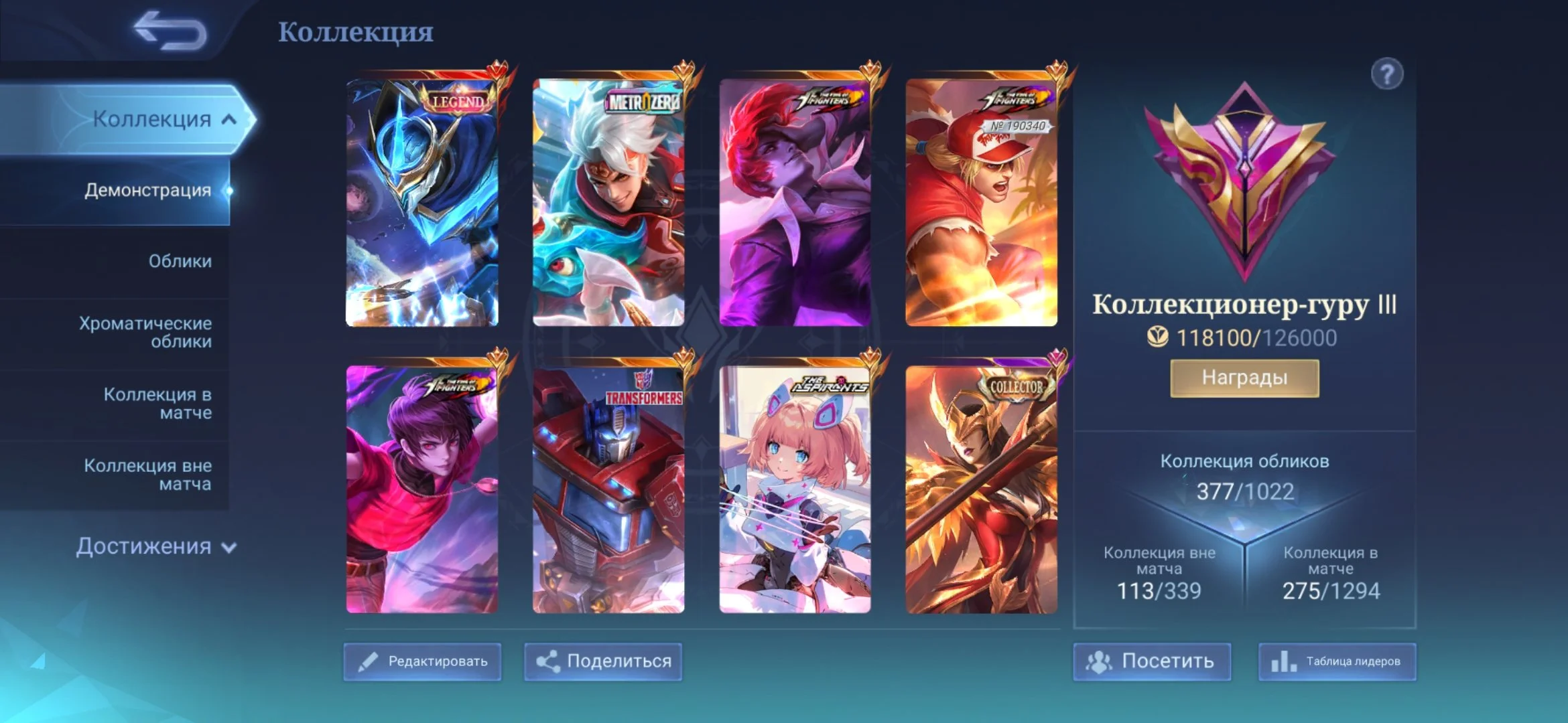 ML501 //Mythic 108, Lega Goose, Metro X.Borg, KOF Chu/Paquito/Darius, Collector Fasha, 377 Skins