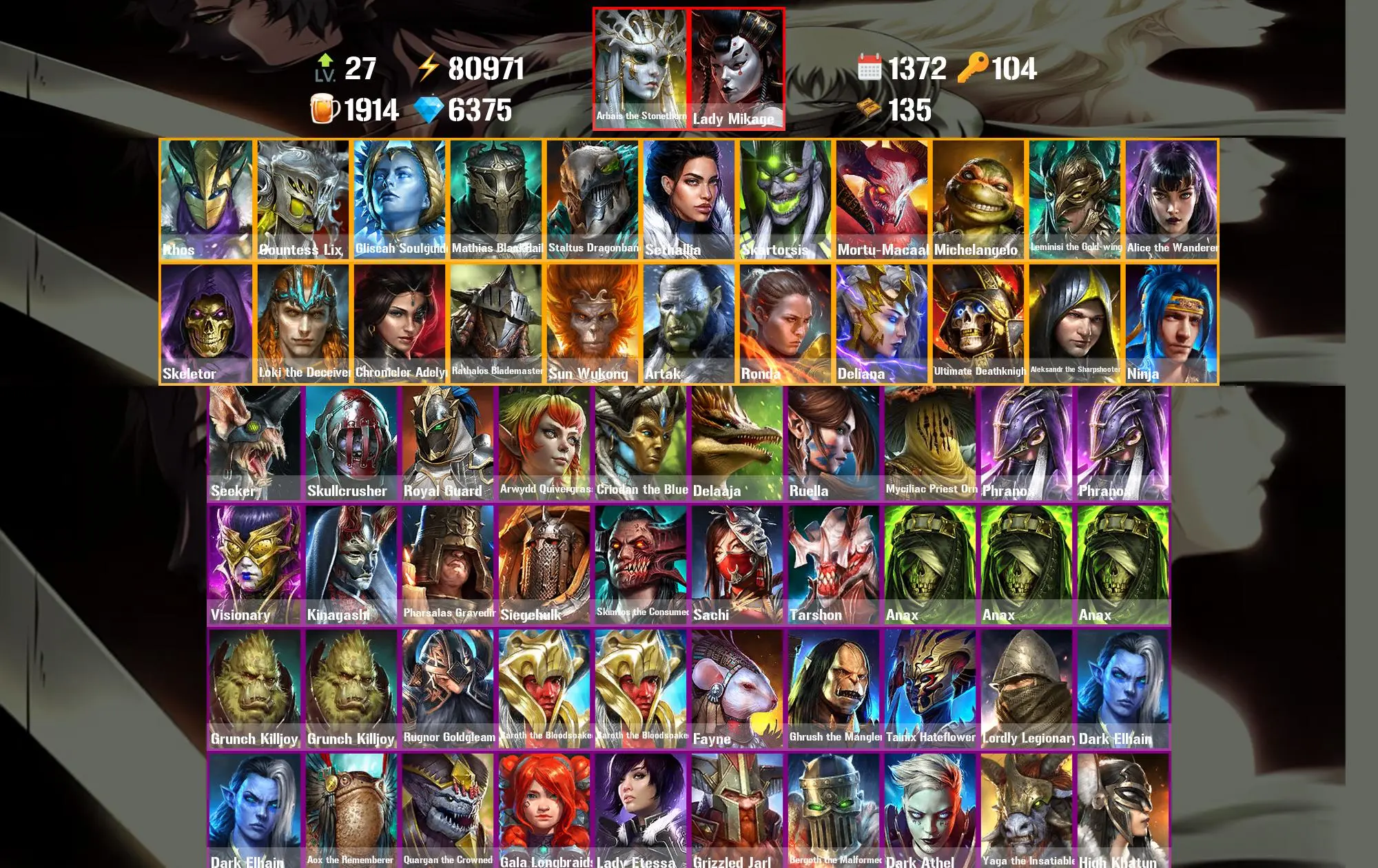 1372 Days 81.0k Energy [Mythical Starter] Arbais the Stonethorn ⸱ Lady Mikage ⸱ Ithos ⸱ Countess Lix ⸱ Gliseah Soulguide ⸱ Mathias Blackflail ⸱ Staltus Dragonbane ⸱ Seeker ⸱ Skullcrusher ⸱ 56.8m Silver ⸱ 6.4k Gems