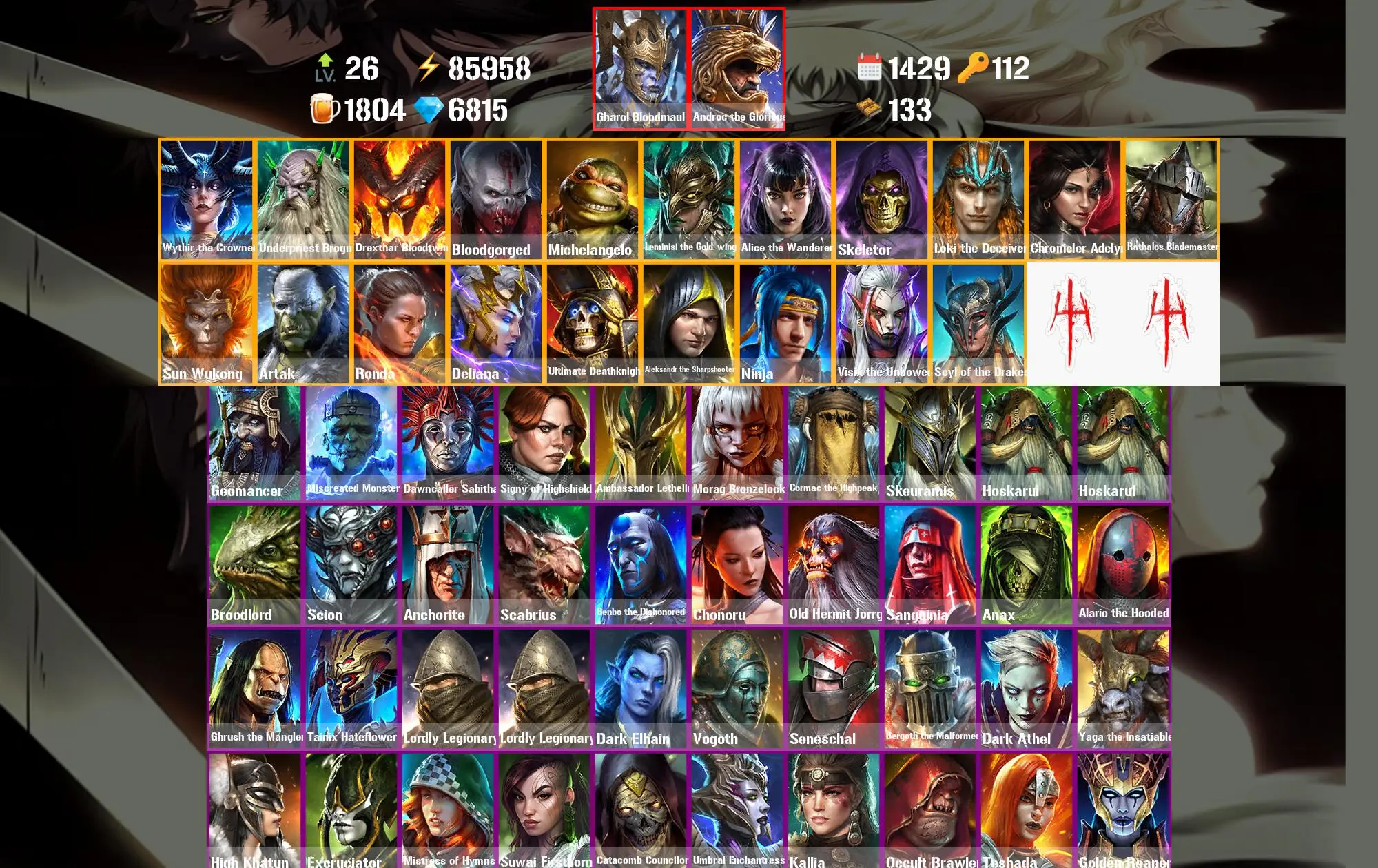 1429 Days 86.0k Energy [Mythical Starter] Gharol Bloodmaul ⸱ Androc the Glorious ⸱ Wythir the Crowned ⸱ Underpriest Brogni ⸱ Drexthar Bloodtwin ⸱ Bloodgorged ⸱ Michelangelo ⸱ Geomancer ⸱ Miscreated Monster ⸱ 54.5m Silver ⸱ 6.8k Gems